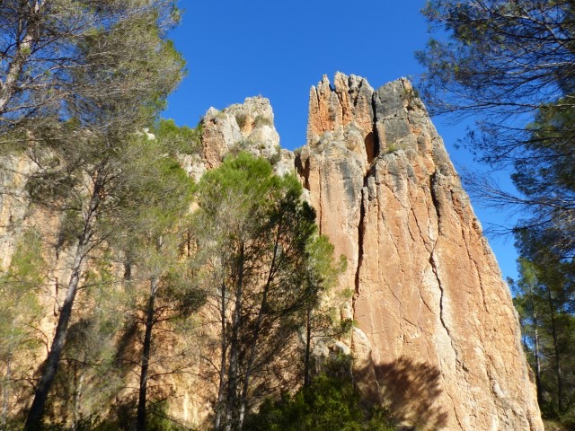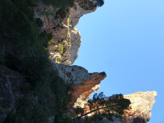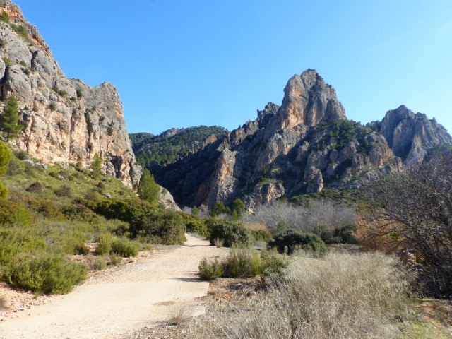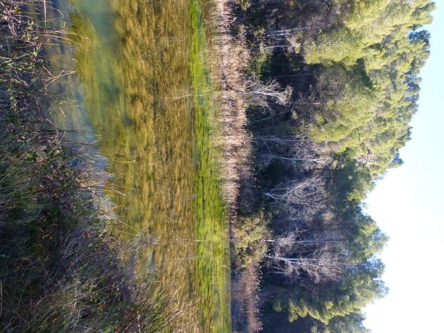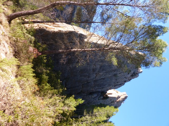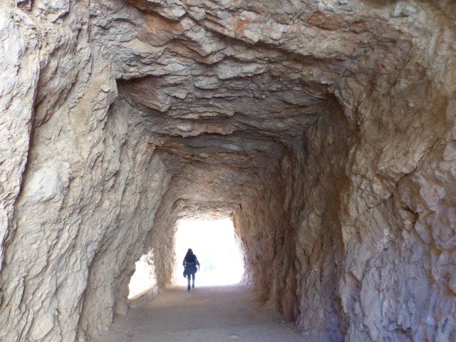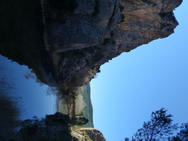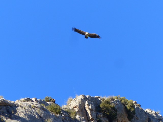 C'est parti pour 8 Km AR, le chemin descend d'abord au bord de la rivière (en contrebas du barrage), puis en suit le lit jusqu'à un espèce de village vacances (sans vacanciers en ce moment de l'année), avec des chalets, des tyroliennes et autres activités d'accrobranches. Le chemin se poursuit ensuite dans un paysage rural puis le long d’énormes formations rocheuses autour desquelles tournent des vautours. On va jusqu’au détour du chemin, (à environ 4 km de notre point de départ), à l’endroit où le paysage s’élargit et où une ferme en ruines nous incite à faire demi tour.