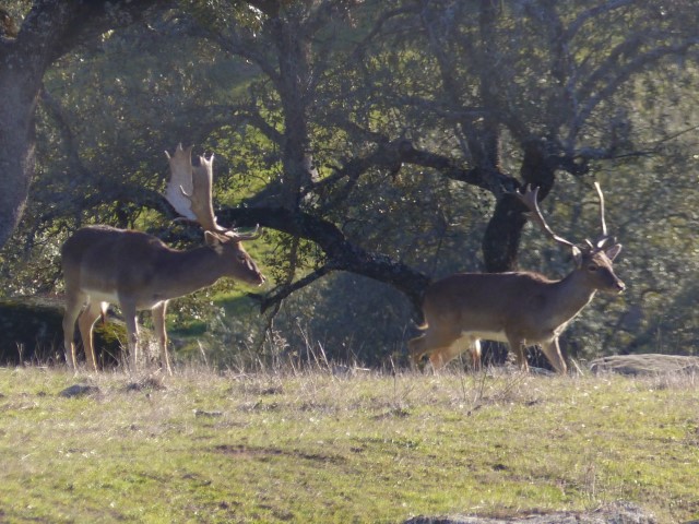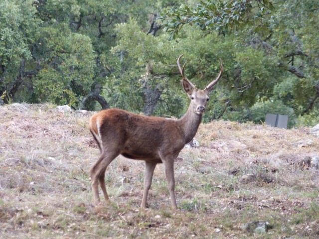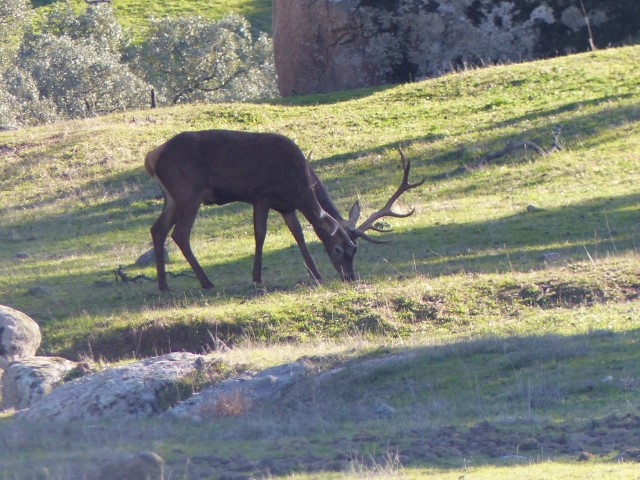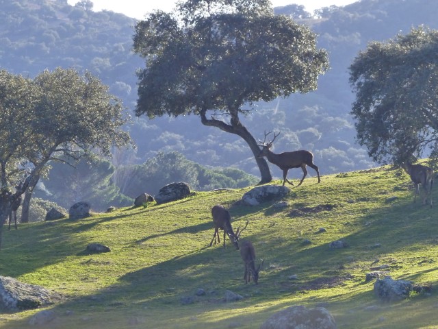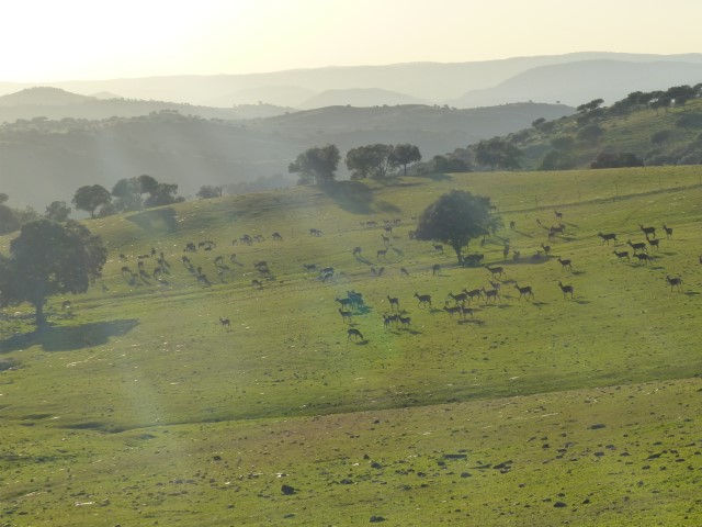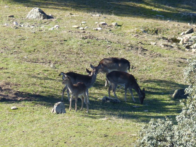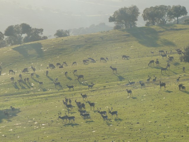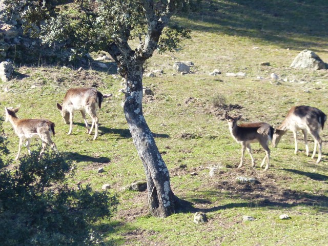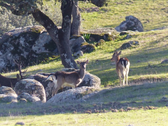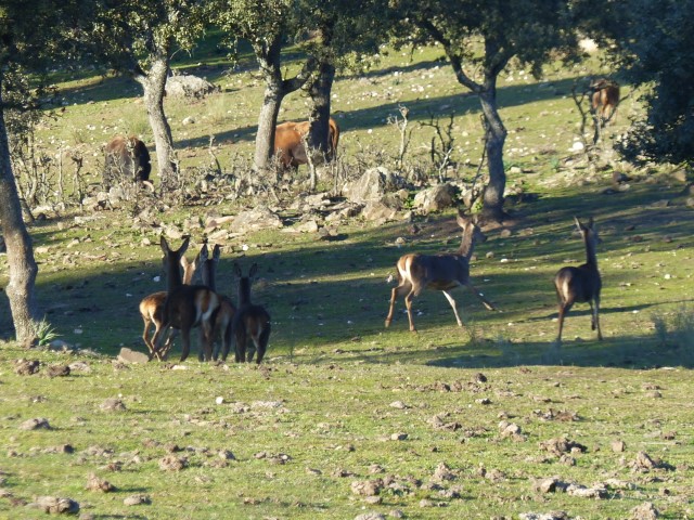 Pour nous ce sera petit déjeuner au soleil, puis balade à pied le long de la piste pour rejoindre l embalse et le coin de baignade. Le lieu est idyllique ...On décide de reprendre la voiture et de continuer cette piste en voiture (a priori une des 2 pistes où on a le plus de chances d’observer le lynx est la « piste de l’Encinarejo » … on pense que c’est celle là….). Malheureusement tout juste après l’endroit où on a fait 1/2 tour à pied, la piste est fermée par un grand portail… on fait donc aussi 1/2 tour en voiture et on se met en quête de la piste de « La Lancha », la 2ème piste recommandée pour le lynx. Celle là se voit sur la carte : c’est parti ! Empruntant une petite route serpentant dans les collines, parsemée d’accès à des fincas ou des maisons de vacances (on ne sait pas), on voit nos 1ers animaux sauvages. Ce ne sont pas des lynx mais des grands ongulés type biches ou chevreuils (désolée, on n’a pas fait d’études en animaux sauvages andalous…).