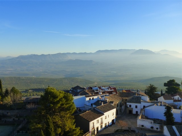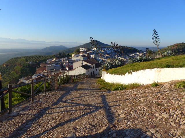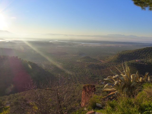 Malheur ! On est à l’ombre de la montagne … On ne sait pas si le Jumpy va démarrer. Du coup, balade obligatoire : on monte tout en haut de la colline qui surplombe la ville, en passant pas les ruelles blanches qui s’éveillent. De la haut, magnifique vue sur les champs d’oliviers et l’Embalse qui scintille tout en bas.