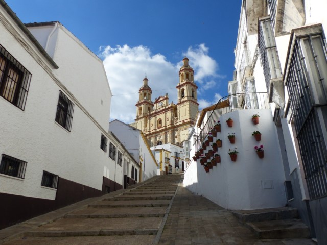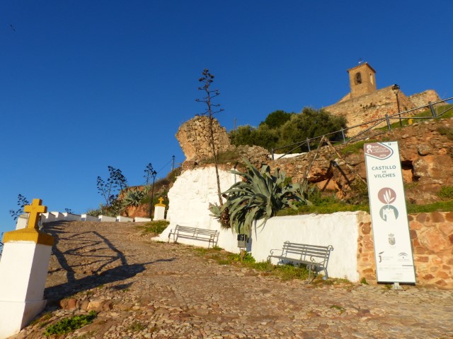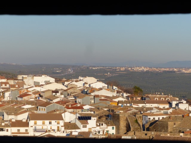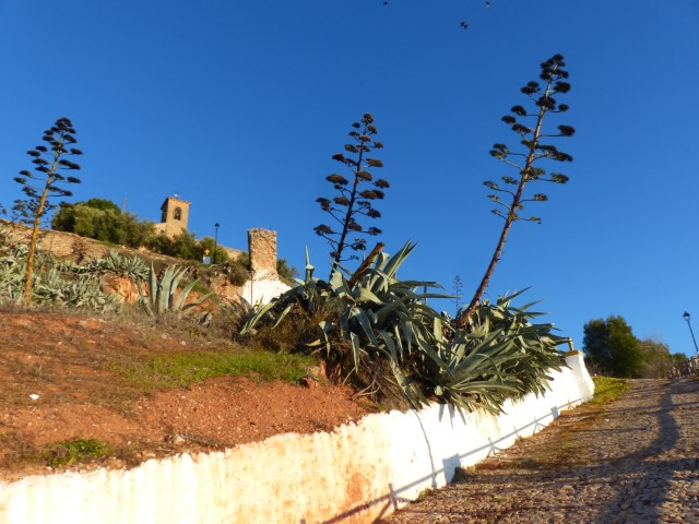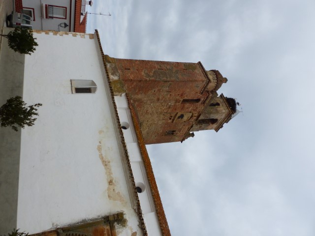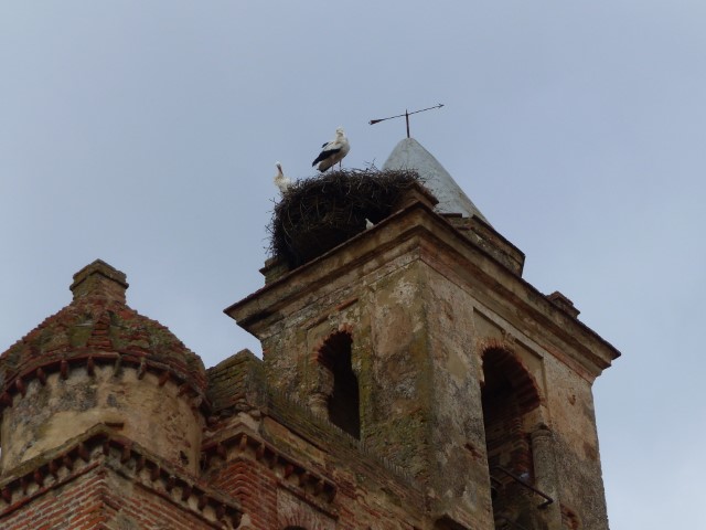 Au bout d’une trentaine de kilomètres, on rejoint la route, puis Alanis (village avec une usine qui fume et qui pue … on se demande si ce n’est pas une usine qui traite les olives). Arrêt sur la place du village, observation des 2 cigognes dans leur nid juché sur le clocher de l’église, puis ascension jusqu’au château qui domine le village (comme partout en Andalousie …).
