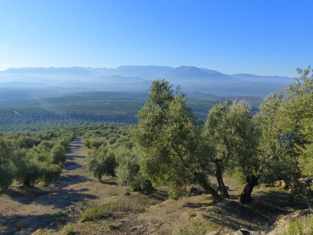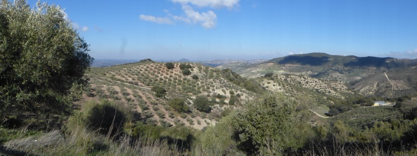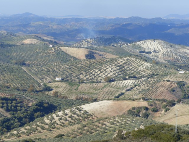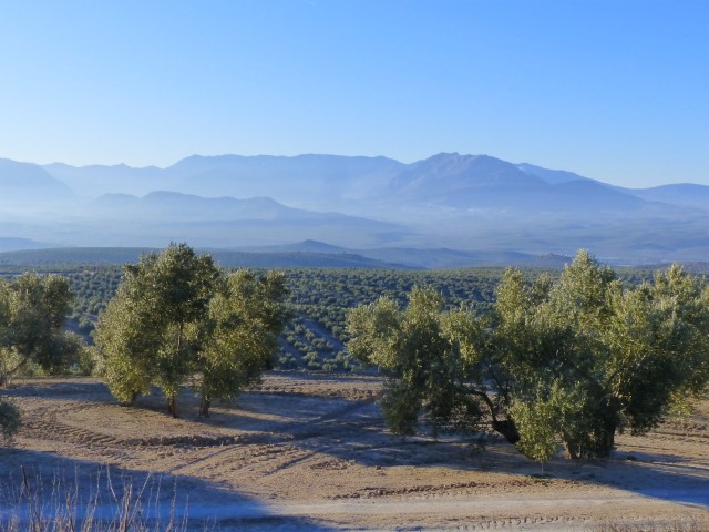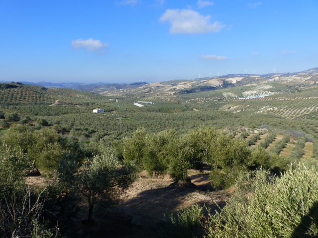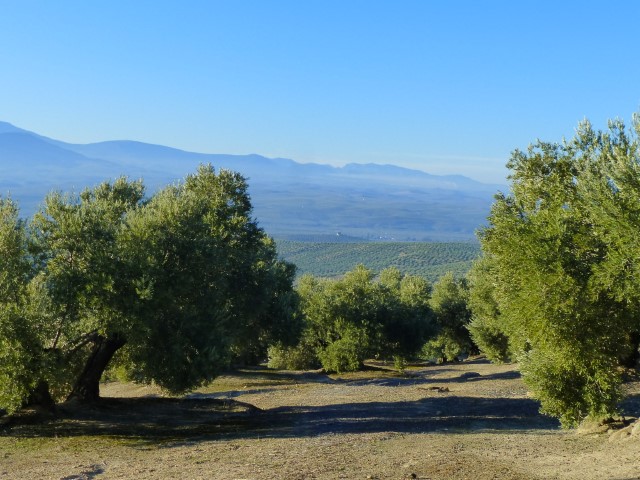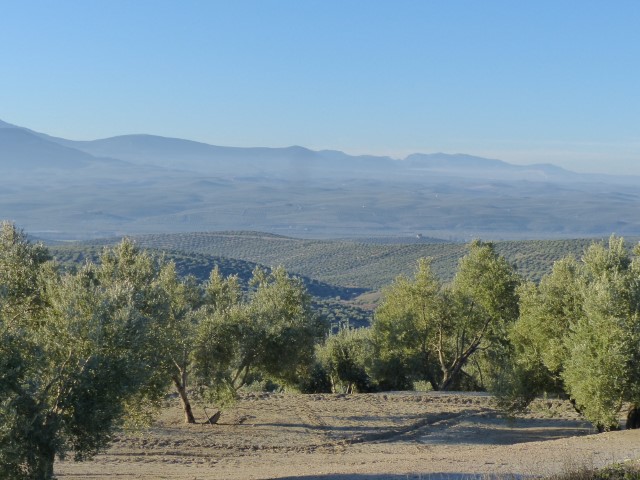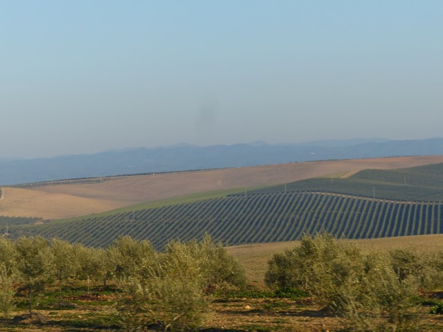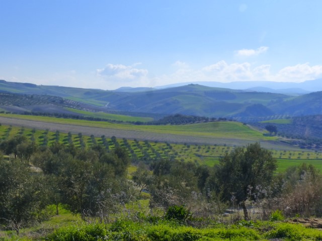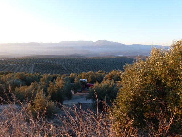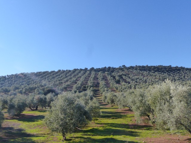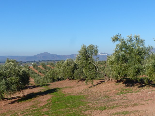 On quitte la ville sans avoir petit déjeuner … on s’arrêtera plus tard sur la route. Le paysage n’invite pas à la pause (tout plat, sans endroit pour s’arrêter), du coup on pousse jusqu’à El Saucejo, village qui se trouve au début de la Sierra (je ne sais pas laquelle mais une chose est sûre : il y a des montagnes et des beaux paysages). Arrêt petit déj au bord de la route, en surplomb de plantations …. d’oliviers …. d’où montent des ronrons de tracteurs.