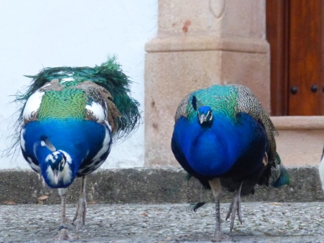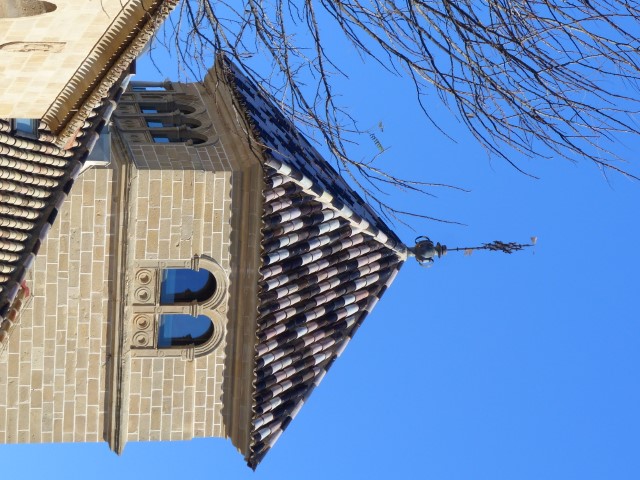 Déjeuner en terrasse sur une plaza devant une magnifique église renaissance. J’ai commandé l’assortiment de tapas, qui se révèlent être tous des plats de viandes : un espèce de ragoût de porc, des brochettes de poulet, des filets de porc au pesto et les mêmes avec des œufs au plat … un peu trop de protéines à mon goût ! Didier lui a pris un plat de tripes qui se sont révélés être des abats non identifiés … et puis 1 salmorejo et des patatas bravas.