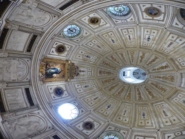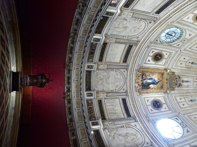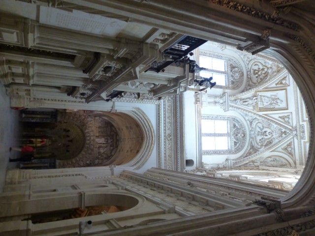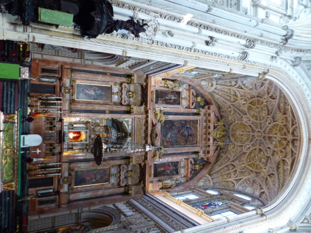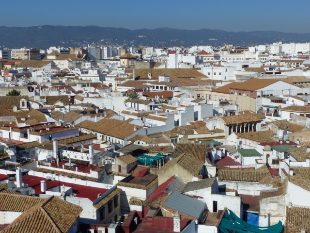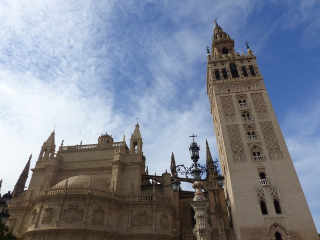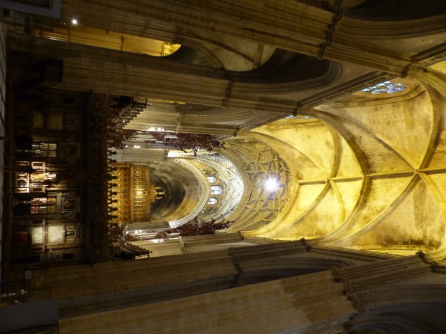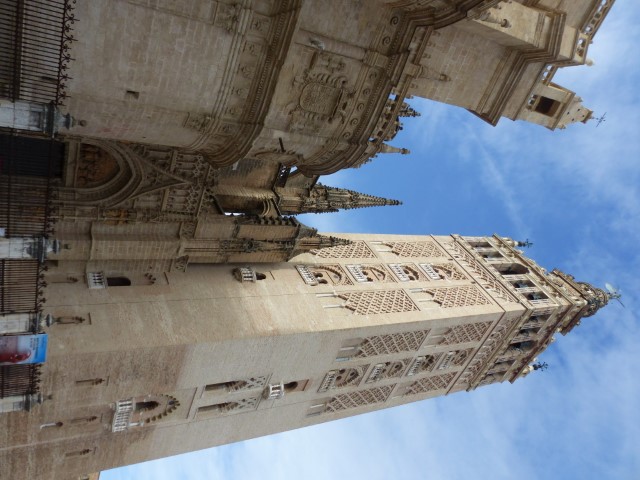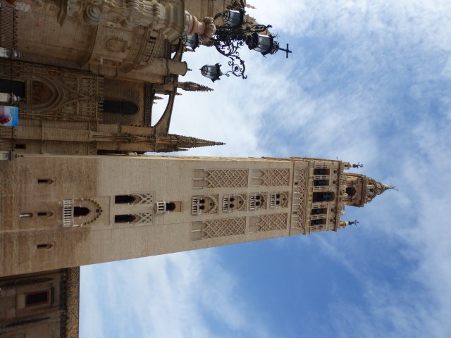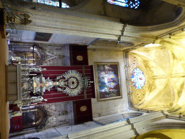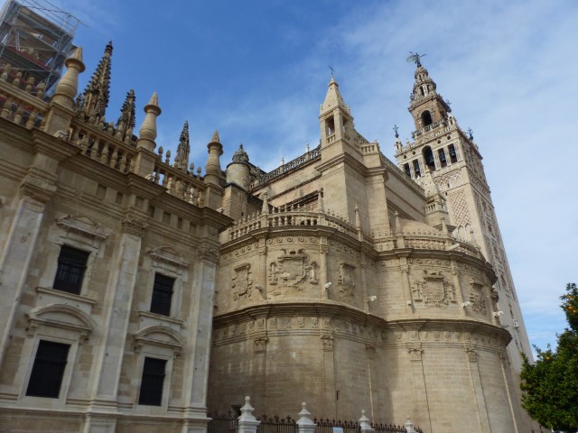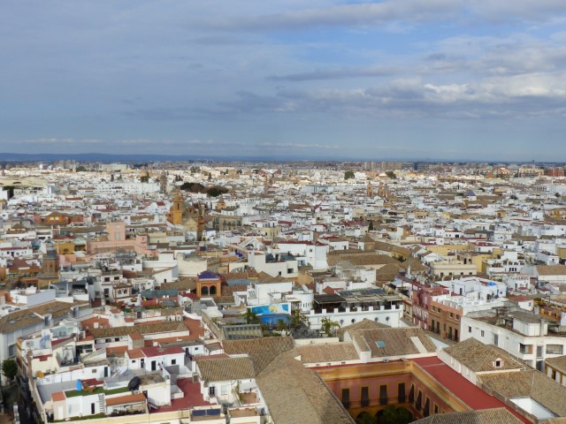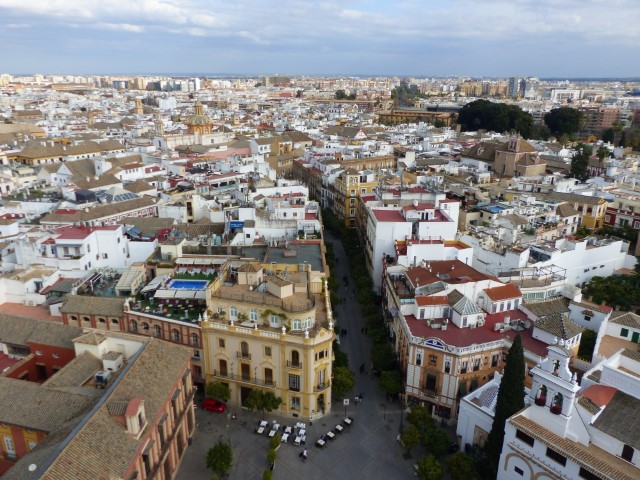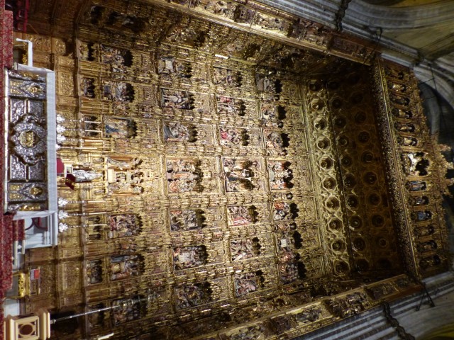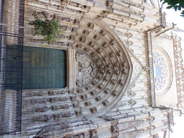 A part ça dans cette cathédrale, il y a plein de tableaux de peintres connus (Goya, Murillo) et moins connus (enfin… moins connus de moi), de la vaisselle en or et argent, un retable gigantesque dégoulinant sous l’or, une couronne ornée de la deuxième plus grosse perle du monde, un nombre incalculable de chapelles, une immense salle du chapitre, un patio des orangers, et enfin la Giralda, tour de style mudéjar (enfin, arabe et chrétienne à la fois, quoi….) au sommet de laquelle on accède par une quarantaine de rampes inclinées (pas d’escalier, les chevaux devaient pouvoir monter jusqu’en haut … ne me demandez pas pourquoi:) ). De là haut on peut admirer la vue sur la ville, et surtout toutes ces terrasses de toit avec piscine… pouvoir contempler la cathédrale de Séville en se prélassant dans sa piscine, le pied !