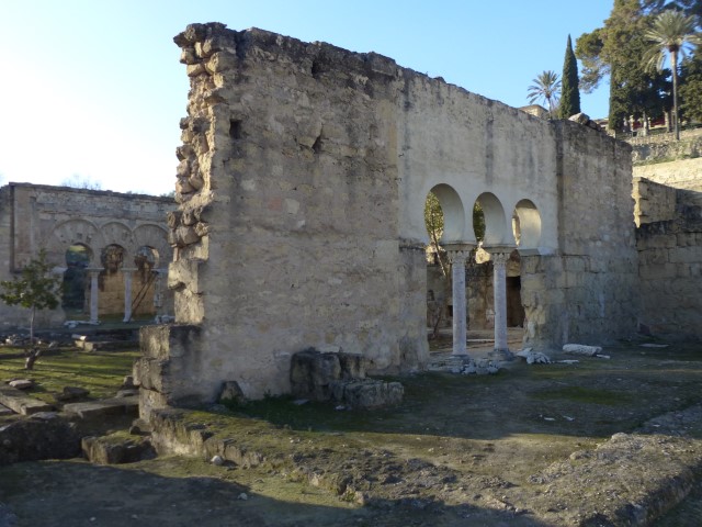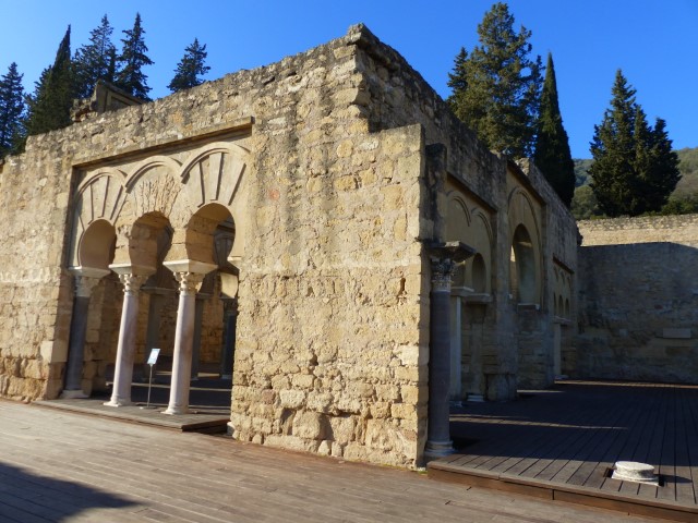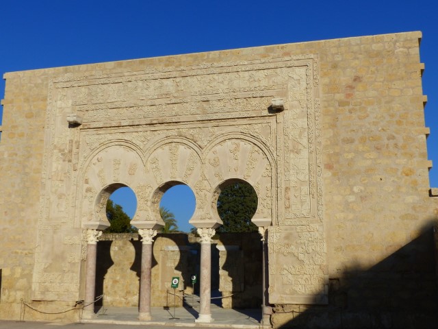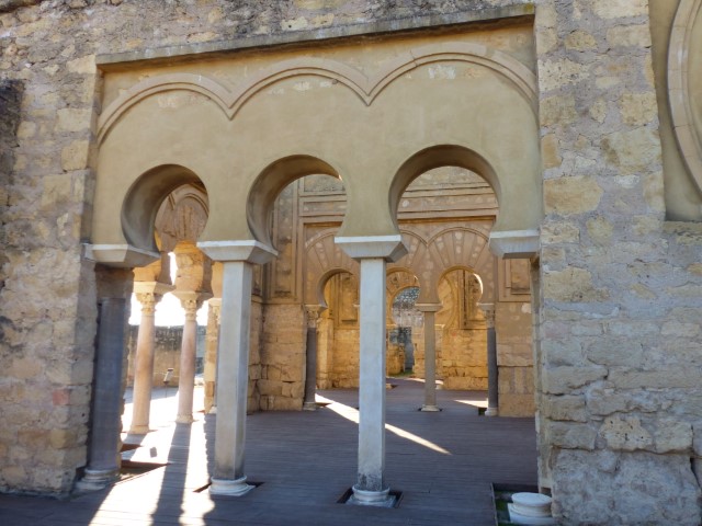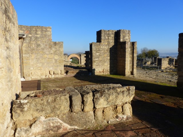 Puis on sort de la ville pour aller visiter la Médina Azara, ancienne ville romaine située à environ 8 km à l’Ouest de Cordoue. Déjeuner sur le parking (désert … on n’ose pas imaginer la foule quand le parking est plein), puis on prend la navette qui nous emmène à l’entrée du site, dans lequel on déambule une petite heure au milieu des vieilles pierres et de quelques belles arches et portes. De retour à la billeterie (gratuite), un film nous permet de nous représenter ce qu’était cette ville à son apogée