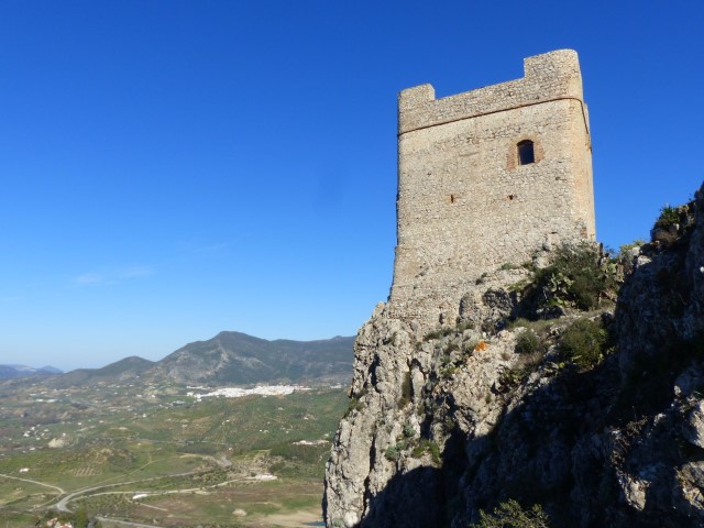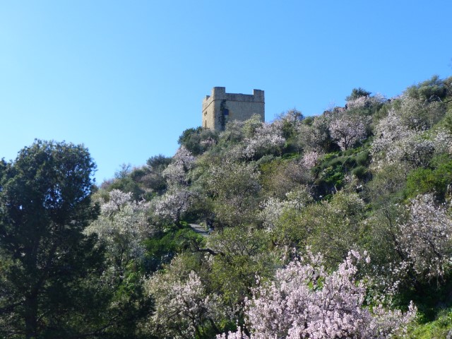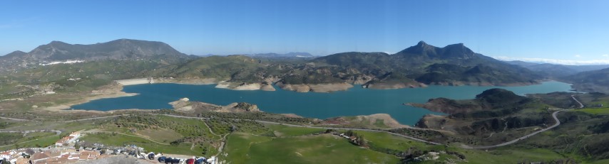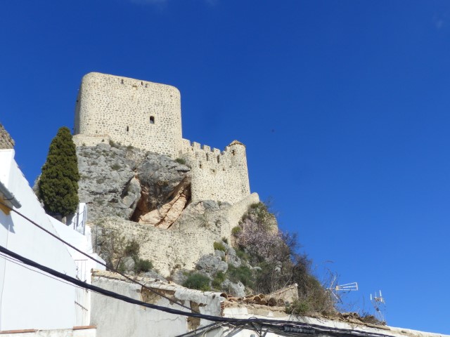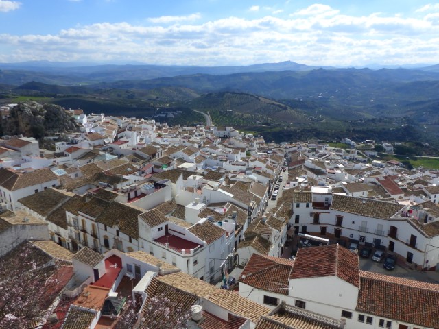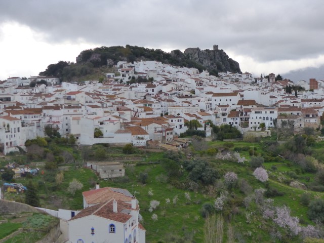 Balade à pied jusqu’à l’ermitage, petit déj, puis route vers Zahara de la Sierra, magnifique village surplombant un embalse bleu turquoise. Le village est encore dans l’ombre, mais on retrouve le soleil en montant pour rejoindre le Castillo qui le domine ; au milieu des arbres fruitiers en fleurs, et avec vue sur l’embalse et la campagne autour, la balade est un enchantement.