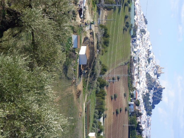 Notre halte de ce soir sera sur une crête face à Ronda (enfin, assez loin quand même, mais on peut admirer le Pont éclairé au loin), au milieu de quelques oliviers, sur une crète, sur un chemin menant à un ermitage inaccessible derrière ses grillages.