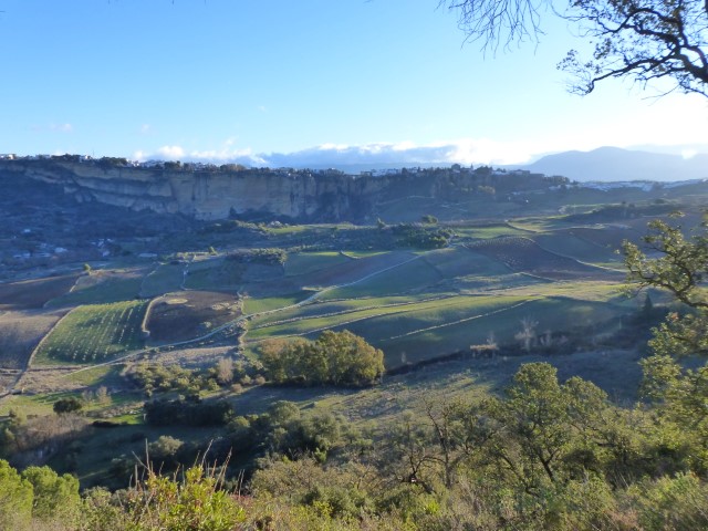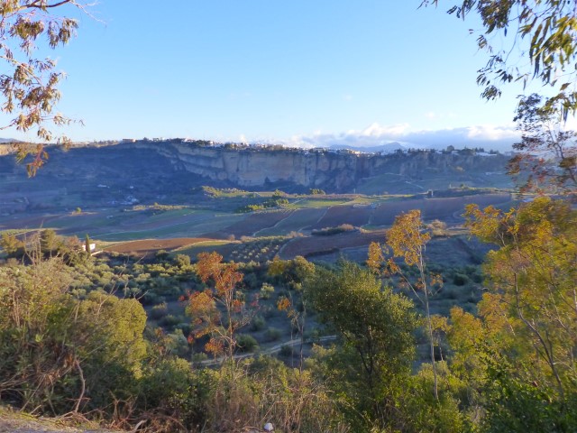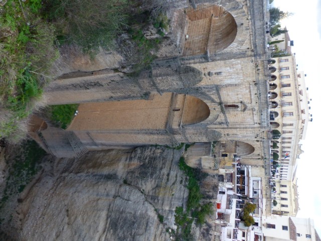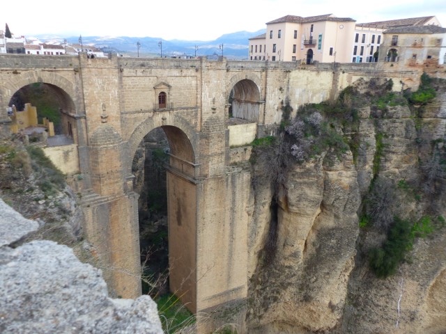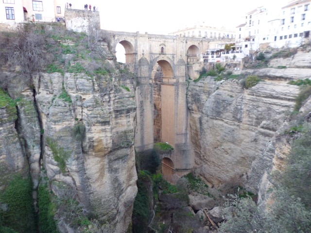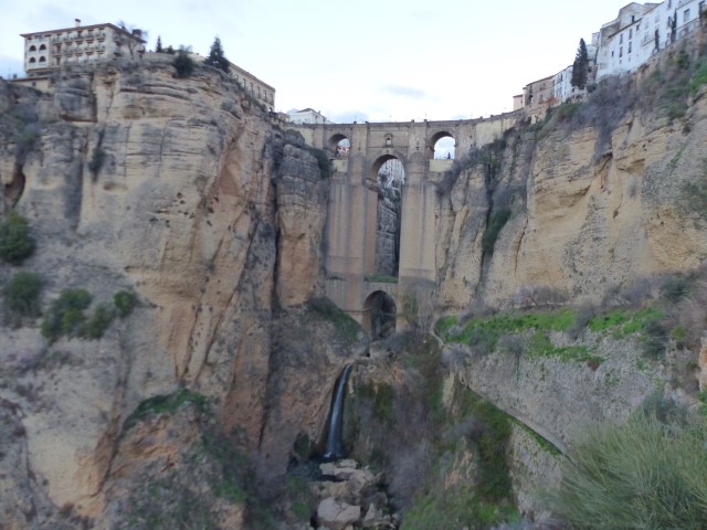 on va à pied jusqu’au Pont Vieux pour prendre toute la mesure de la gorge au dessus de laquelle est construite Ronda, et on remonte de l’autre côté de la rivière. Et comme on n’en a pas assez de crapahuter, on suit la rivière dans l’autre sens pour arriver jusqu’à un mirador d’où l’on peut encore admirer le pont neuf.