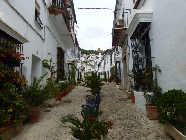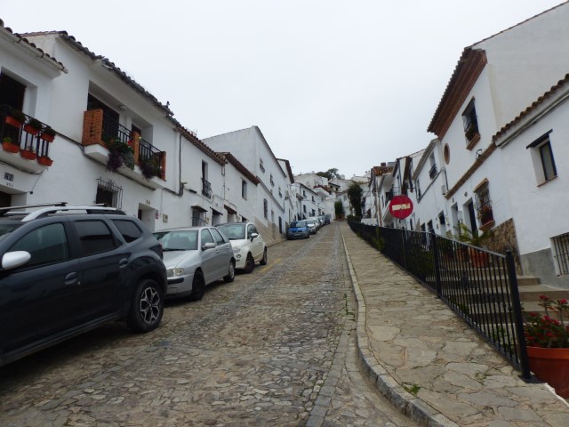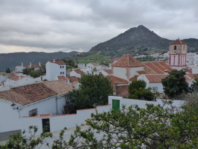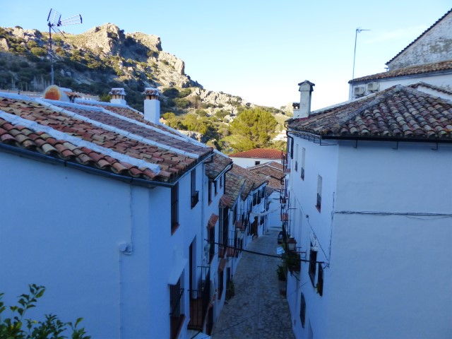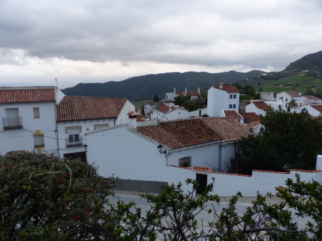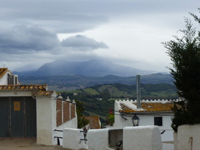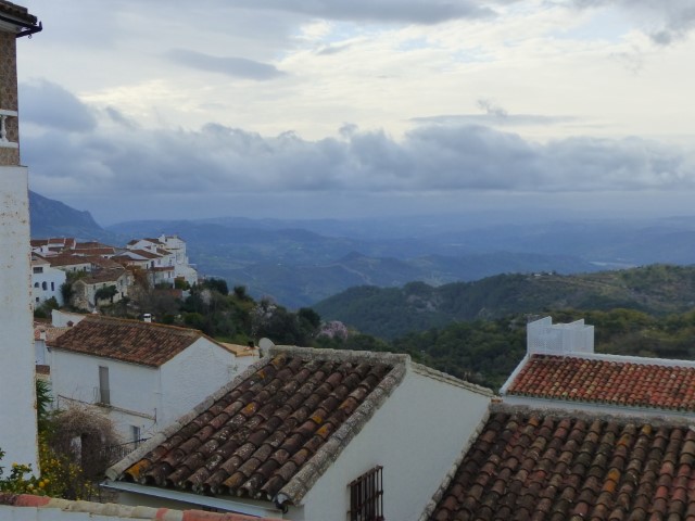 Ce matin nous visitons Gaucin sous un ciel gris. A pied, on arpente les rues à la recherche d’un café ouvert pour prendre le petit déjeuner. On en trouve un, mais une fois qu’on est installés le patron nous dit qu’ils ne font pas de petit déjeuner. Tant pis, on prend une boisson chaude, et on mangera nos tartines de retour à la voiture. Gaucin est un village en balcon sur Gibraltar, la Méditerranée et le Maroc. D’ailleurs j’aperçois les 3 au fond, dans le ciel gris, mais Didier ne veut pas me croire : il dit que ce que je prend pour la mer est en fait un nuage … Le village est mignon, avec plein de plantes et de jardinières intégrées dans les murs.