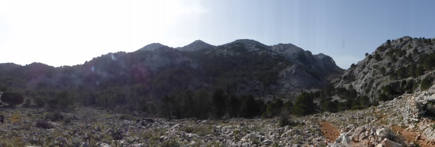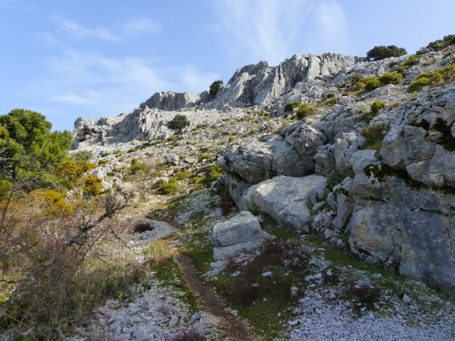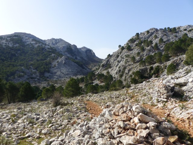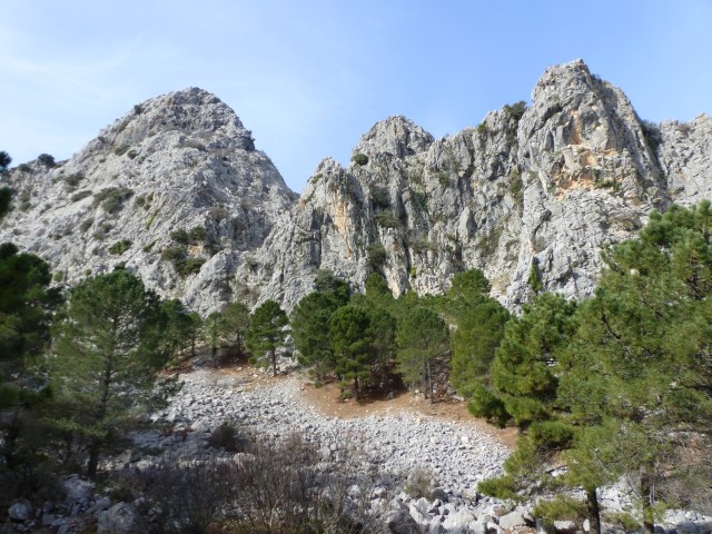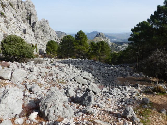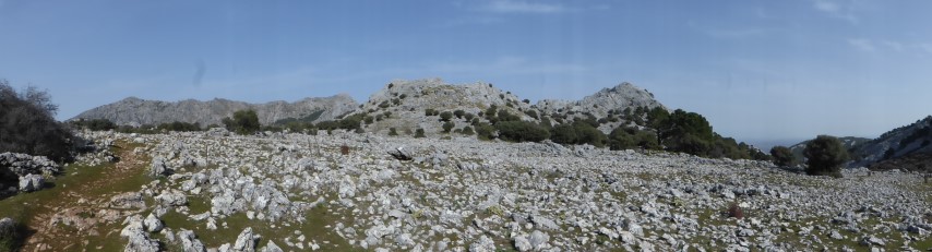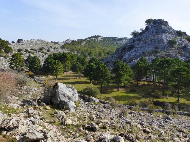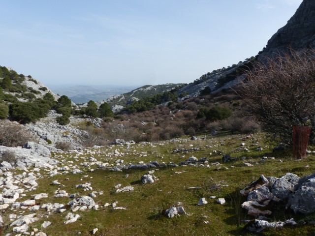 On se lève à 9H passé - très bonne nuit, donc… - puis on remonte à Grazalema pour une rando dans la Sierra du même nom. Nous montons dans un paysage très très minéral (très karstique, diraient certainement les spécialistes), où se trouve quand même un petit plateau herbeux avec des enclos à bestiaux (apparemment dans le temps, ils y cultivaient des pois chiches et quelques céréales, profitant du limon déposé par le ruisseau qui passe là), puis au bout de 2 h nous atteignons un col – toujours aussi minéral – et redescendons vers un mirador qui se situe au bord de la route entre El Bosque et Grazalema. Pique Nique avant d’entamer la redescente. C’est dimanche et tous les sentiers de la sierra sont envahis d’espagnols bruyants, familles et trailers.