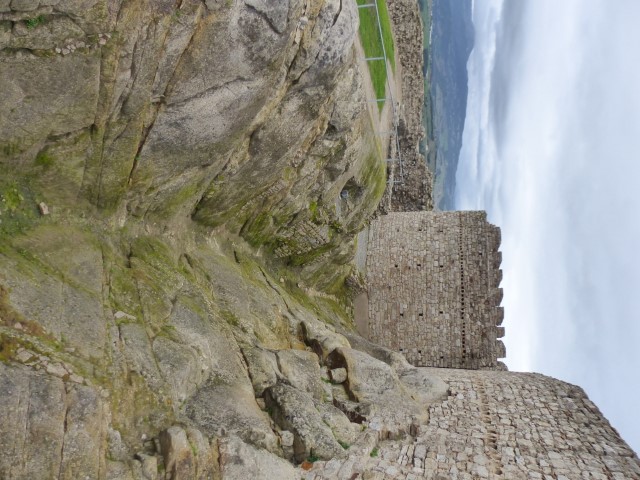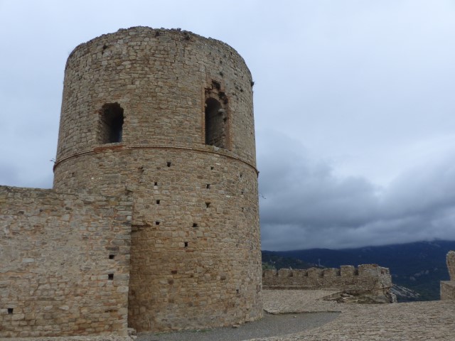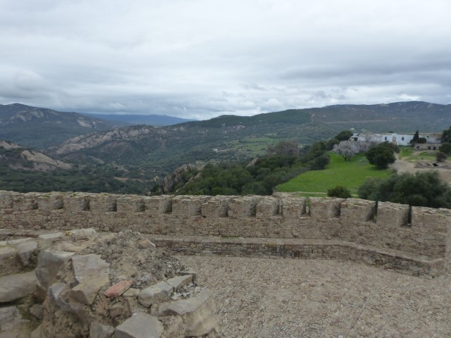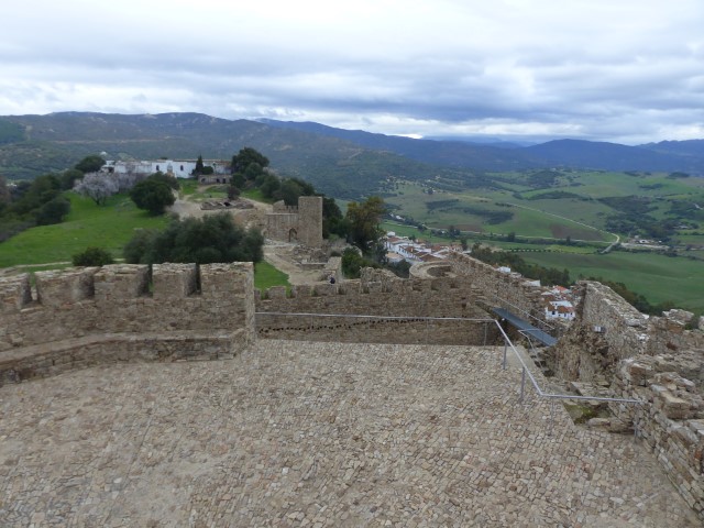 On rejoint la voiture et déjeunons dans un parc avec une magnifique vue sur mer (selon moi), sous le château. On entame le raidillon pour le visiter mais il est justement fermé le lundi. Zut ! Du coup on essaie de s’extirper de ce village : pas facile avec tous ces sens interdits et ces ruelles hypers étroites aux fortes pentes. On ne demande si on n’est pas condamné à errer dans le village jusqu’à la fin de nos jours, même le GPS est perdu ! Finalement on trouve la sortie et on prend la route direction Jimena de la Frontera, que l’on visite également par un temps froid et nuageux. On se gare en bas du village et c’est parti pour une sacrée grimpette jusqu’à la forteresse tout en haut. Il y a là, datant des arabes, une porte d’entrée, des entrepôts, un cimetière (récent celui là : à se demander comment ils montent leurs morts jusque là haut car il n’y a pas de route d’accès, juste une petite allée pavée), des douves (si si … creusées dans la roche), une tour, et des bâtiments à l’utilisation indéterminée en cours de réhabilitation.