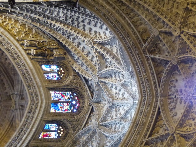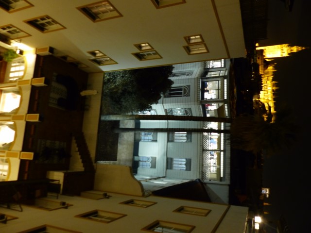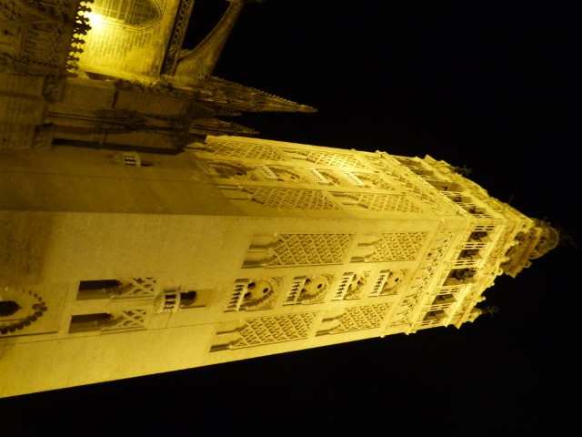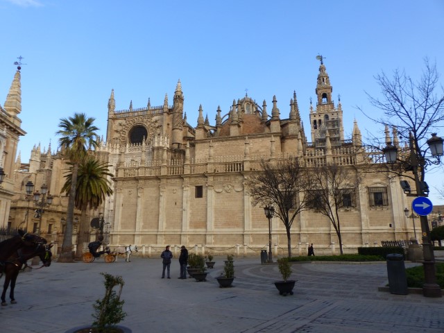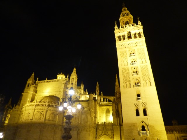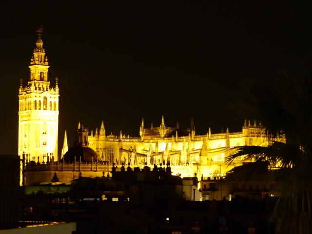 Installation à l’Hôtel Vincci la Rabida où pour 102 euros on a une chambre avec vue sur patio (donc sans vue:) ) et un petit déj buffet. Mais l’hôtel a un bar-restaurant en roof top avec vue sur la cathédrale. On y monte immédiatement puis petite balade nocturne jusqu’à la cathédrale dont on fait le tour et qu’on admire sous toutes ses coutures (effectivement elle est impressionnante : c est la + grande cathédrale gothique du monde et la 3ème + plus grande cathédrale après St Pierre de Rome et St Paul à Londres).