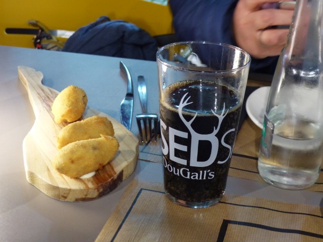Avant d’affronter la cathédrale, nous allons reprendre des forces dans notre désormais restau préféré de Séville, le Sal Gorda. Au menu aujourd’hui : croquetas (encore), patatas bravas (encore), mais aussi des nouveautés : tartare de thon rouge, cannelonis de viande inconnue, risotto aux cèpes (avec goût de truffes : excellentissime!) et une bière brune locale.