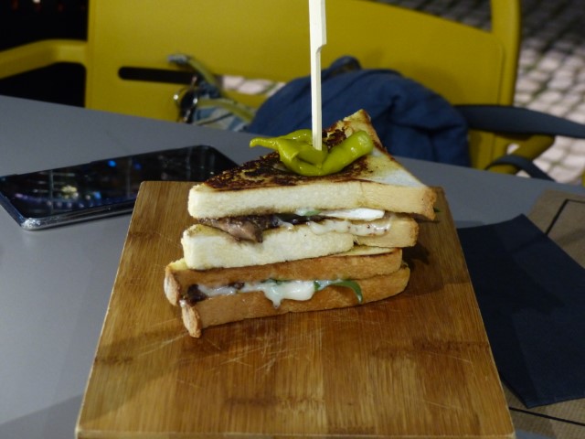 Dîner d’excellents tapas à la Sal Gorda (recommandé par le Lonely Planet) : Croquetas Jamon, Patatas Bravas, Pilons de poulet sauce piquante, « brioche » (en fait sorte de croque monsieur) avec bœuf, fromage, moutarde. La voisine de table, une française installée à Séville depuis 2 ans et ayant ouvert un salon de thé, confirme aux autres voisins de table (également français, jeunes informaticiens en télétravail dans le coin) que c’est un excellent resto de tapas.