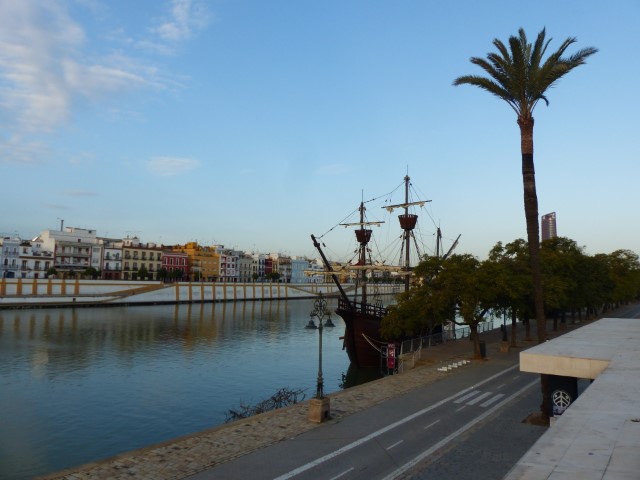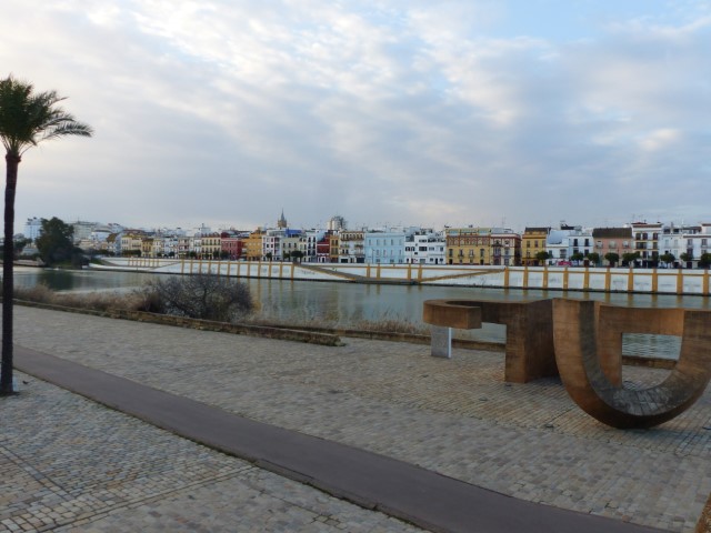 Petit déj en terrasse (ensoleillée mais frisquette) au bord du Guadalquivir ; on suit les conseils de Manu et on prend la spécialité andalouse : pain toasté aspergé d’huile d’olive puis recouvert de purée de tomate (on a pris la version avec jambon et fromage).