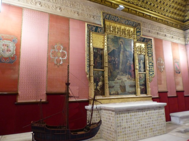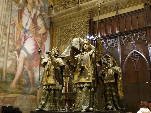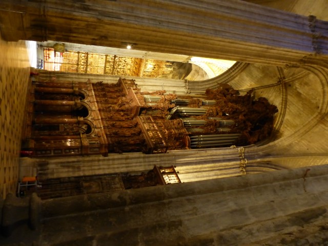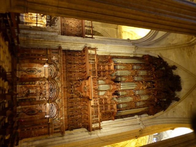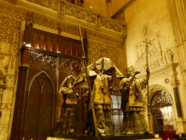 Visite de la cathédrale de dimensions pharaoniques (c’est bien simple, on s’y perd …). Le point de ralliement est le tombeau de Christophe Colomb, porté par 4 statues représentant l’Aragon, la Castille, le Léon (et le 4ème j’ai oublié : peut être La Manche?). Il faut dire ici (moment culturel) que ce bon vieux Christophe a voyagé quasiment autant étant mort que vivant : enterré à Valladolid, puis déménagé à Séville, puis à St Domingue (selon ses vœux exprimés dans son testament) puis à Cuba (quand les français ont pris (acheté) St Domingue), puis retour à Séville.
