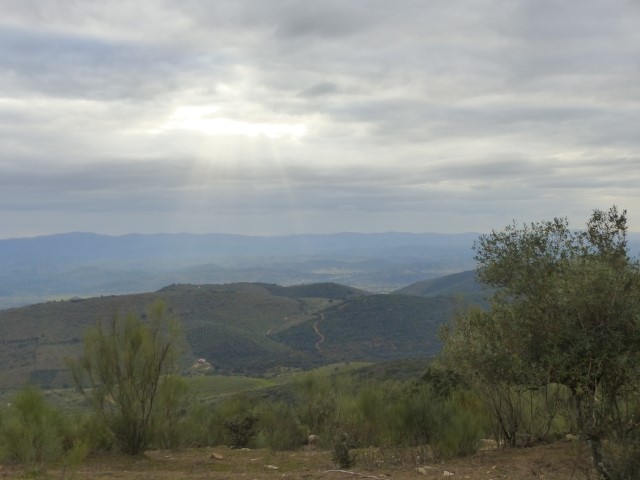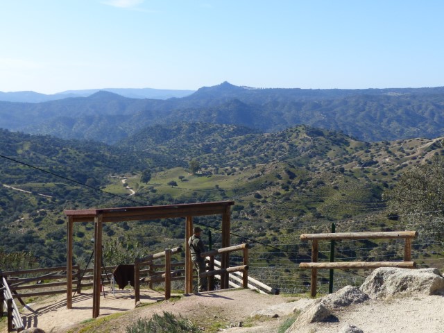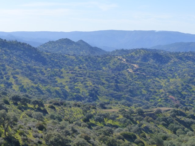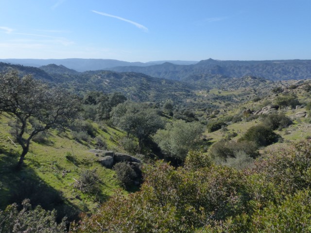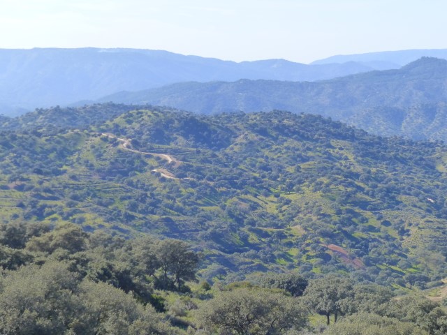 On avise sur la carte une petite route verte toute tordue (=plein de virages) qui va dans la direction que l’on a choisie (c’est à dire le nord est). Cette petite route est mal entretenue, avec plein de trous et de bosses, mais magnifique. Il faut dire que le soleil revenu y fait aussi beaucoup … On slalome entre les chênes lièges, et comme partout dans le coin, les barbelés. Les fincas sont immenses et bien fermées !