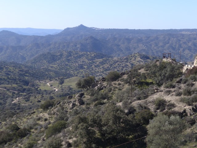 On veut rejoindre la région des Pedroches, vantée par le guide comme des grandes étendues désertes où le regard se perd. Et ben c’est bof … il faut dire qu’on ne sort pas de la route principale, mais on ne trouve strictement aucune intérêt à cette région…. Du coup on pousse jusqu’à Cardena (parque naturel de la sierra de Cardena), on rejoint par une piste de 6 km un village moitié retapé (qui doit à la belle saison servir de village de gîtes, il y a même une piscine mais sans eau), on déjeune au soleil accompagné des 3 chiens du lieu, puis on part se dégourdir les jambes sur un sendero qui serpente au milieu des chênes lièges (on est toujours entourés de fils barbelés, dans lesquels on croit reconnaître des « passages à lynx » = petites « trappes » d’environ 20 cm sur 20 cm, d’où partent des petits passages bien visibles dans la végétation).