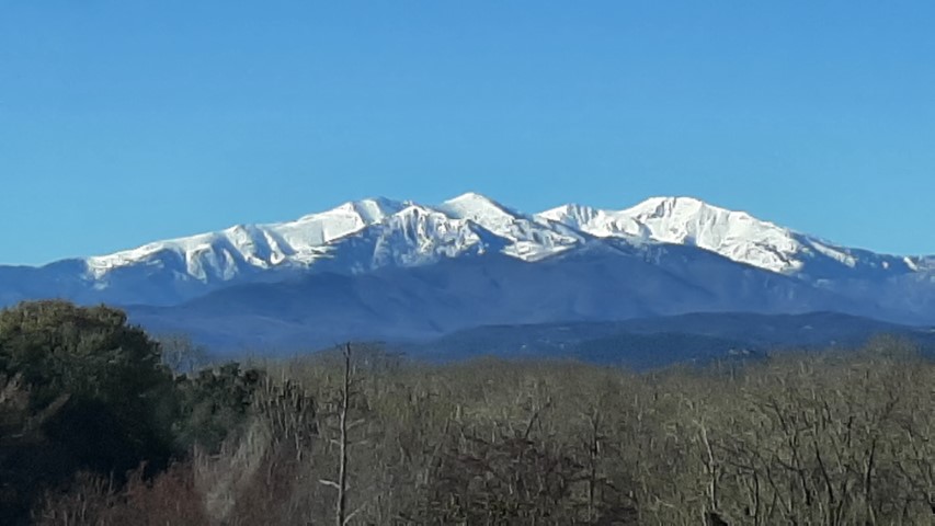 Arrêt courses au supermarché de Clermont l'Héraut puis tout droit direction l'Espagne. Sur l'autoroute entre Narbonne et Perpignan : la mer et les étangs d'un côté, les Pyrénées étincelantes de l'autre : c'est magnifique !