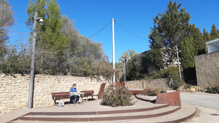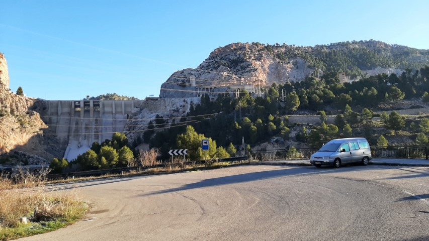 Au niveau de Valencia, on bifurque sur l'autoroute direction Madrid. Bien plus tard, nous nous arrêtons aux abords de Villagordo Del Gabriel où un camping est indiqué. Il est fermé en cette saison. L'endroit est paisible, nous nous installons, sur une petit espace en bordure de la route; un parking point de départ de rando, face à un barrage qui nous domine.