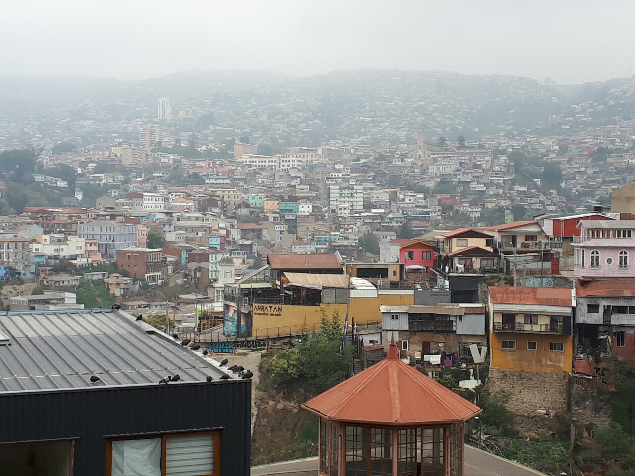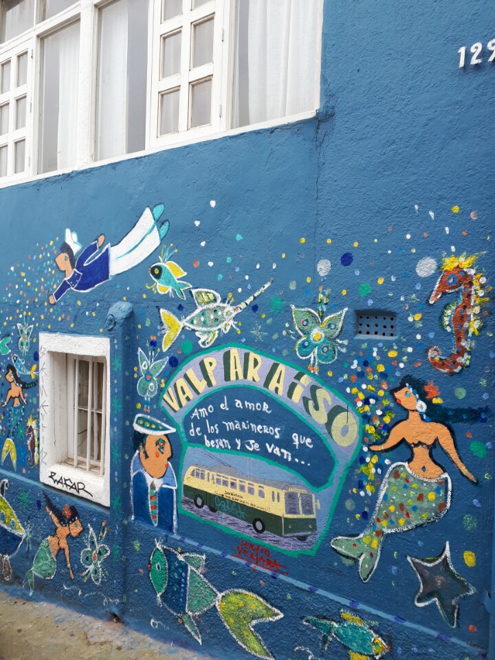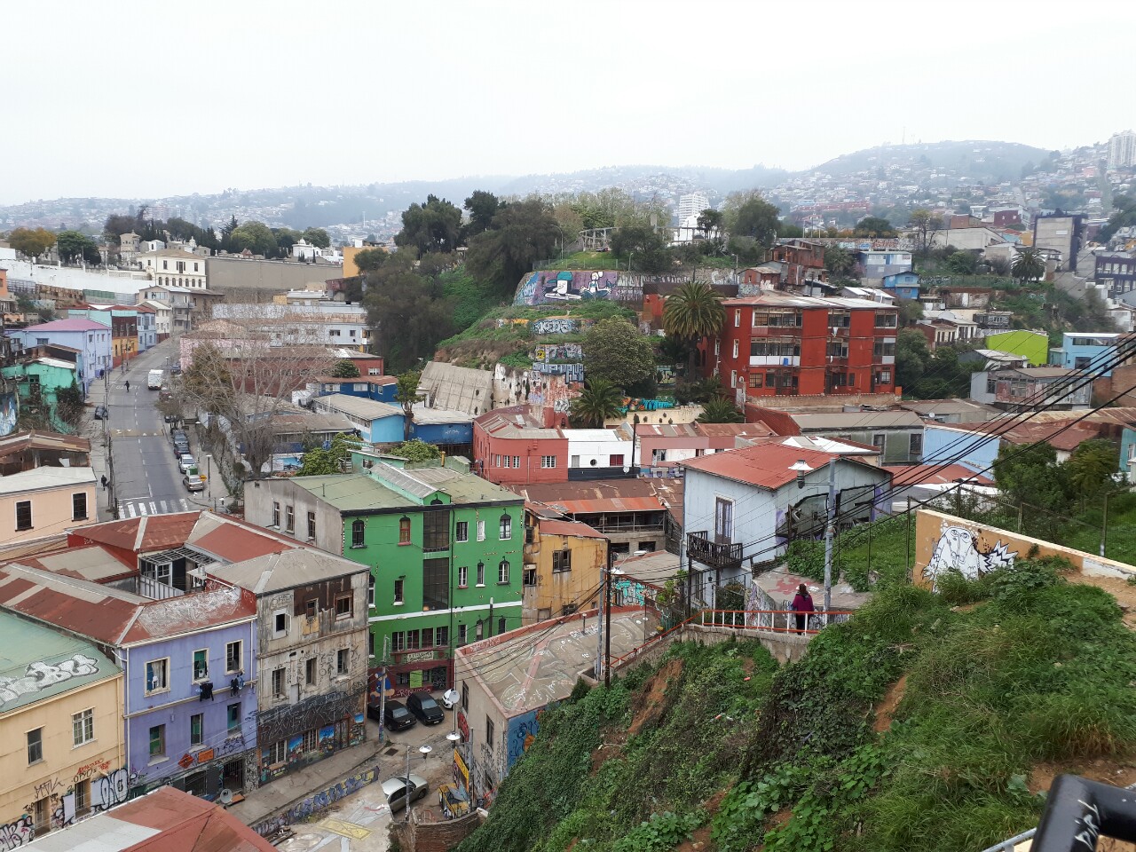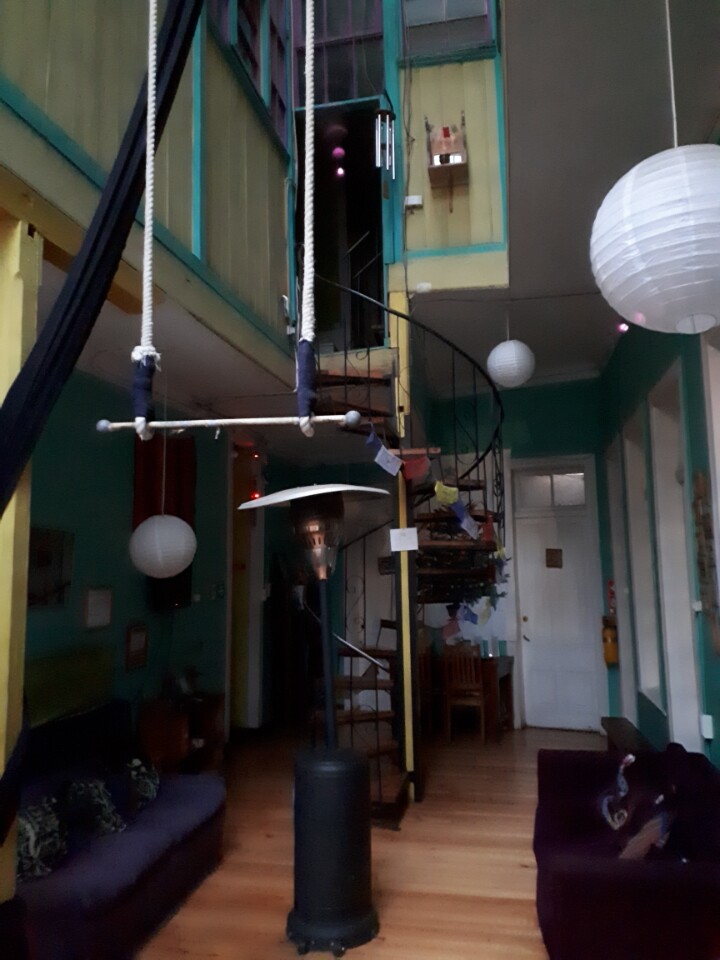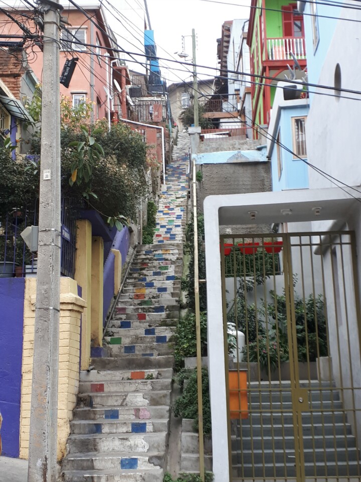 S'il faisait grand beau temps à Santiago, c'est sous un ciel gris que nous faisons nos premiers pas à Valparaiso. Nous sommes chargés chacun d'un grand sac à dos et d'un plus petit. Nous rejoignons, sans encombre, notre hébergement Casa verde limon, en slalomans entre les marchands ambulants, au bout d'une bonne vingtaine de minutes de marche. Par chance, notre chambre vient d'être rendue accessible, nous pouvons nous decharger et profiter d'une bonne douche.