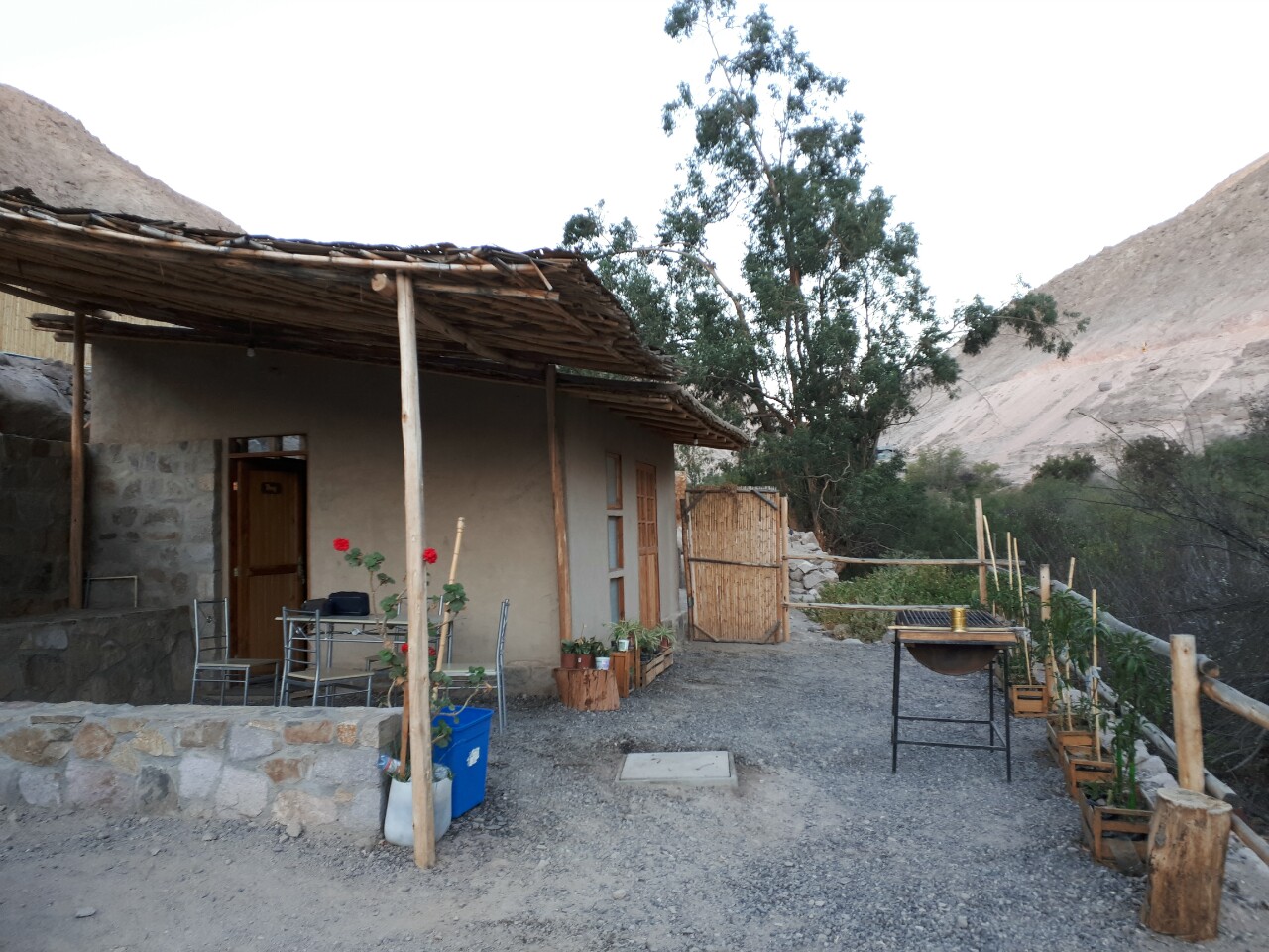 A Codpa, nous logeons dans une maison construite en pisé local (adobe). Une chambre avec un queen bed, une salle de douche, et dehors, une terrasse. C'est un bungalow dédié aux touristes, il y en a un autre, inoccupé en ce monent. L'électricité est solaire et nous disposons d'une fontaine à eau. Il n'est pas conseillé de boire de l'eau du robinet au Chili. Nous surplombons un jardin bizarrement organisé, mais rempli d'arbres fruitiers. Il y a des pêchés, des goyaviers, des eucalyptus, des cactus en fleur, des plants de tomates garnis. Il y a aussi trois cuves pour bains chauds norvegiens, malheureusement ils ne sont pas en service à cette saison.