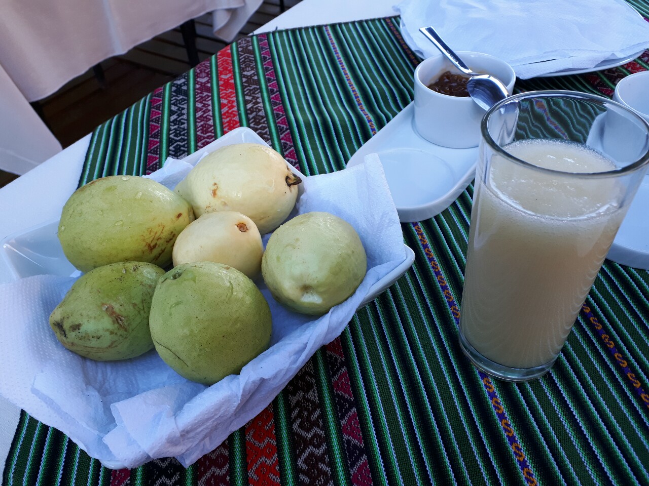 Le petit déjeuner nous est servi en bas de la propriété, à proximité du ruisseau. Il y fait très frais, bien plus que quelques mètres plus haut. La différence est impressionnante. Nous avons droit à du pain et des confitures de pêche et de goyave maison. Du jus de goyave, des goyaves fraiches, des crêpes et, cerise sur le gâteau, des fruits de cactus (figues de barbarie? ). Nous ne parvenons pas à tout finir.