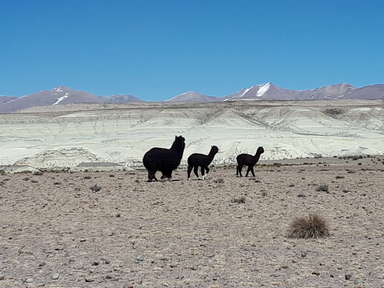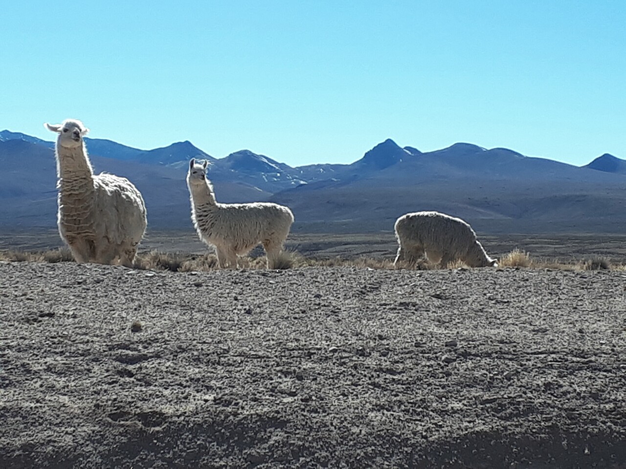 Sur la route nous croisons des troupeaux sauvages de lamas, de vigognes et d'alpaga. La différence semble se faire au niveau des oreilles. Courbées pour les premiers, droites pour les seconds et petites pour les derniers.