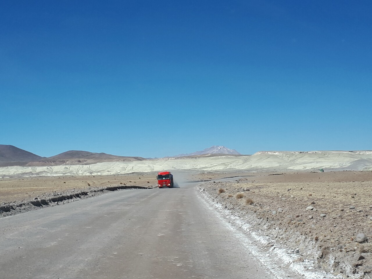 Nous finissons le trajet sur la route principale menant d'Érica à Putre. Elle est sillonnee quasi exclusivement de camions, dans les deux sens. Il y a tout particulièrement des camions de transport d'essence, manifestement un commerce organisé avec la Bolivie.