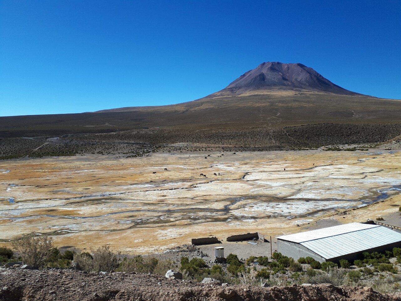 Nous petit déjeunons avec du thé, du pain en forme de galette, de la confiture, du yaourt pour moi et du fromage pour Chris. Il y a également des petits biscuits et du jus d'abricot. Nous filons ensuite vers notre première étape, le salar de surire à près de 4400m. Notre hôte nous a indiqué que notre journée serait longue et il s'est enquis du fait que nous disposions à minima d'un SUV. Nous lui avons acheté une carte qui couvre de Putre à Colchane, 15km avant Cariquima, notre point de chute. Il faut compter environ deux cents cinquante kilomètres et au moins 5 heures de conduite. Sur le trajet, il y a donc le salar de Surire. Un lieu magique, paysage grandiose d'un lac de sel, bordé de flamants roses et de lamas en liberté.