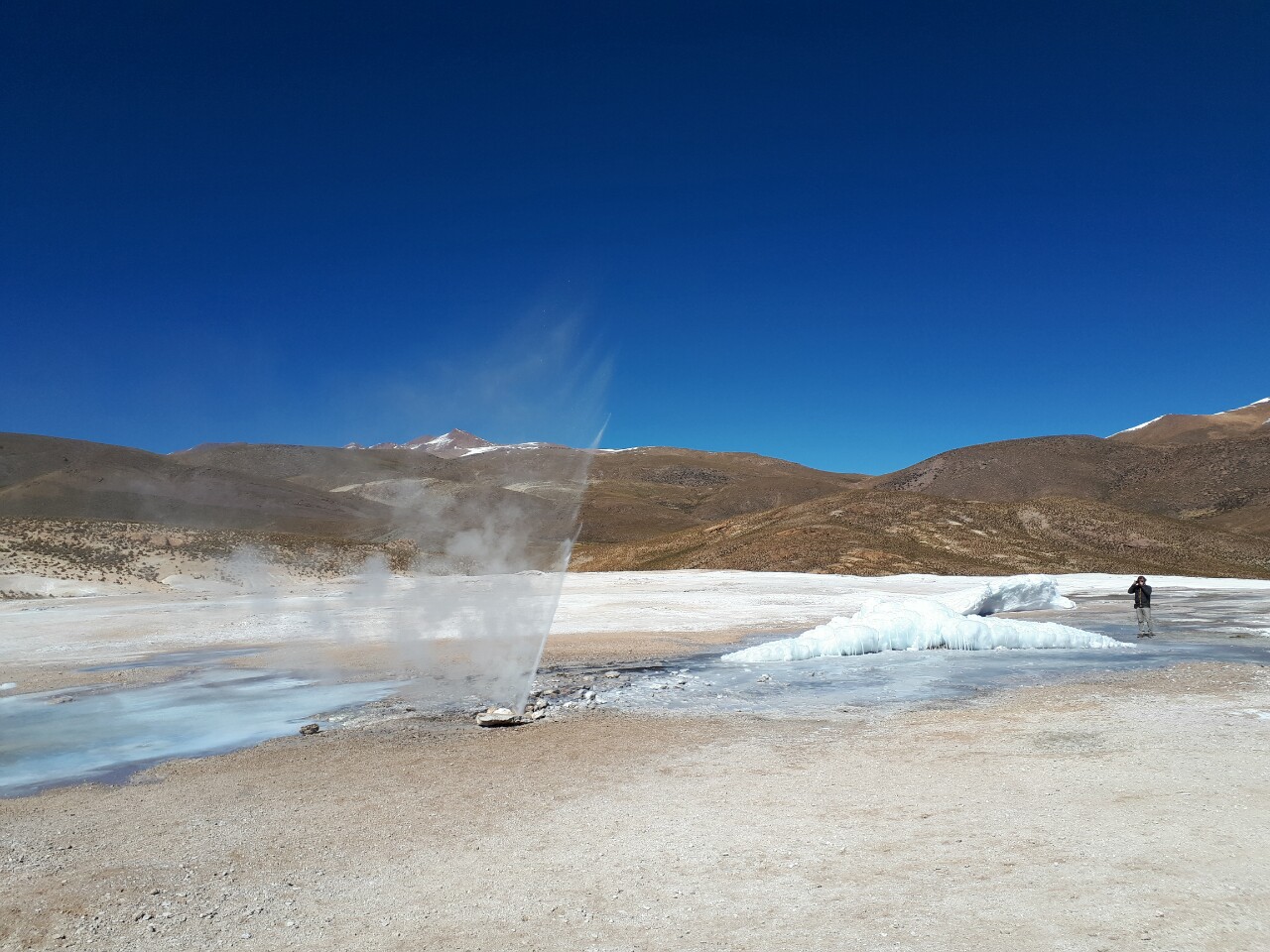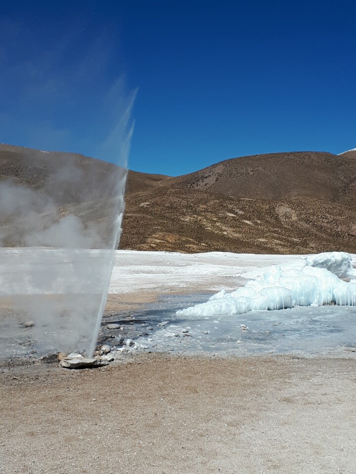 - arrivee sur site vers 9h00, au matin les fumerolles sont plus impressionnantes car difference de température air/eau plus importante (eau bouille à 86 degrés à cette altitude de 4 300 mètres)