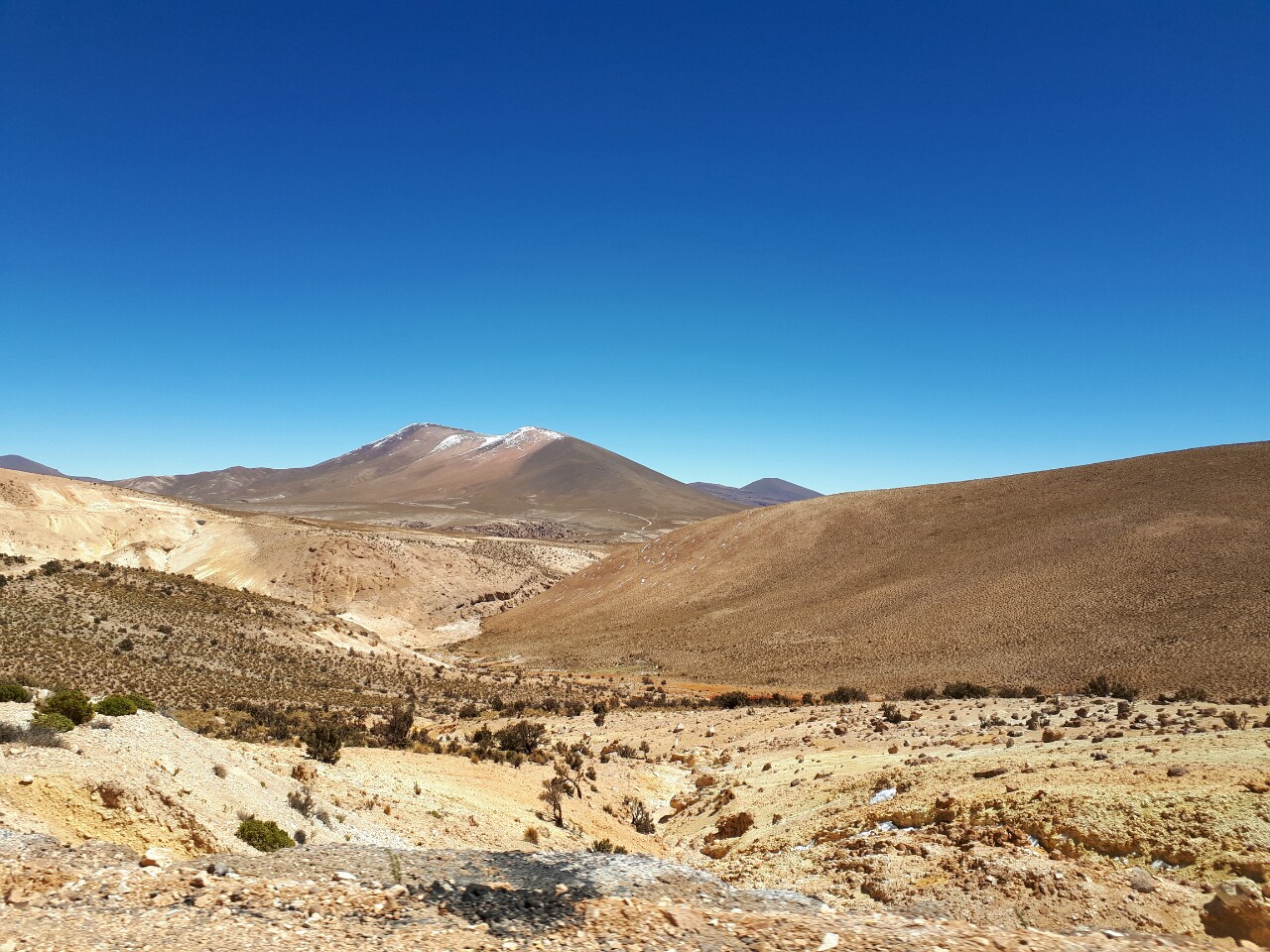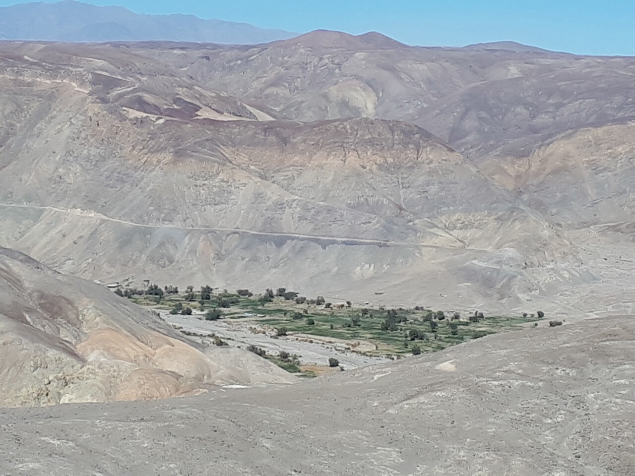 Nous quittons Arica pour aller dans le désert. Destination Podca, un coin de verdure perdu au fond d'une vallée contrastant avec le paysage aride alentour. Il fait très chaud sur le trajet, mais en roulant vitres ouvertes, la climatisation n'est pas nécessaire. Par contre, à chaque arrêt une chaleur brûlante se fait ressentir. Le paysage est magnifique. Nous avons la route pour nous; personne devant, personne derrière.