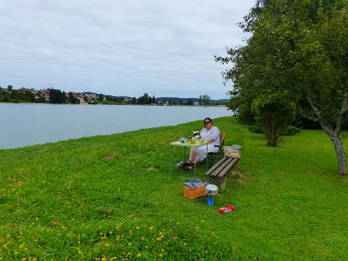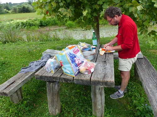 Nous prenons la route en direction de Bled, une ville très touristique. Nous passons par des pistes (routes normales ici) et nous arrêtons pique-niquer en pleine campagne. Nous sortons la table est les chaises. Nous devons faire très anglais ainsi installés en bord de piste. Quelques voitures passent. S'il l'on veut obtenir un sourire, il faut faire un signe de la main, ou sourire le premier, mais le Slovène ne manifeste aucune réaction autrement.