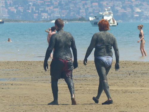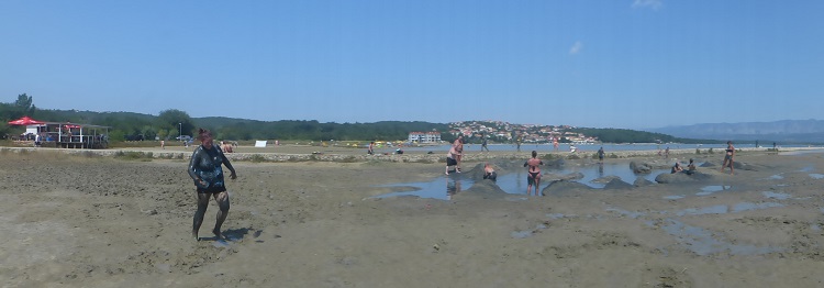 Nous quittons Krk pour rejoindre de nouveau le continent. Pas besoin de bac cette fois, un pont nous ramène au continent Croate. Bizarrement, pas de péage dans notre sens de circulation. Dans l'autre sens ce n'est pas la même musique; il faut faire la queue et payer le passage. Nous nous arrêtons à Soline pour prendre un bain d'argile avant de nous rincer dans une mer hyper chaude. Le bain d'argile transforme chacun en petit bonhomme tout noir. Très insolite! Le lieu est magnifique et pour une fois il est facile de s'y garer et il n'y a pas d'horodateur. A signaler vraiment !!