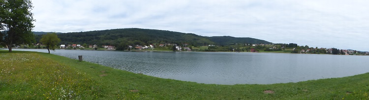 Nous quittons le camping et nous arrêtons au village tout proche. La carte indique la présence d'un lac et nous allons nous y promener. Le lac est en fait tout petit. Nous continuons dans le fond de la vallée où, l'hiver, des pistes de ski de fond y sont dessinées. La boucle passe par notre camping de la veille. Comme souvent, il reste quelques estivants mais une grosse partie des occupants est partie voir ailleurs.