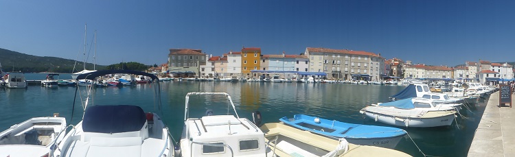 L'ile de Cres est un bout de cailloux tout allongé entouré de mer. Une route la traverse en son milieu sur toute sa longueur. Il y a très peu d'habitations, toutes sont regroupées dans les quelques villes portuaires que nous traversons. Les vues sont magnifiques, lorsqu'elles donnent sur la mer. Pour le reste, ce sont des espaces diformes recouverts de pierres toutes aussi diformes. Nous nous arrêtons sur le port de Cres, ville/village du même nom que l'ile. Les maisons sont colorées. Le port pénètre dans la ville et constitue son centre ville. C'est paisible et cela donne envie de prendre le temps de s'arrêter à ne rien faire.