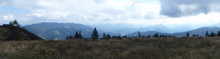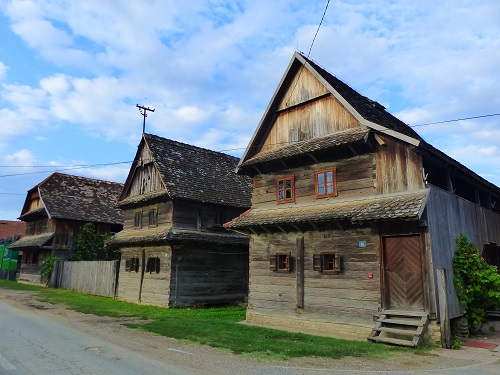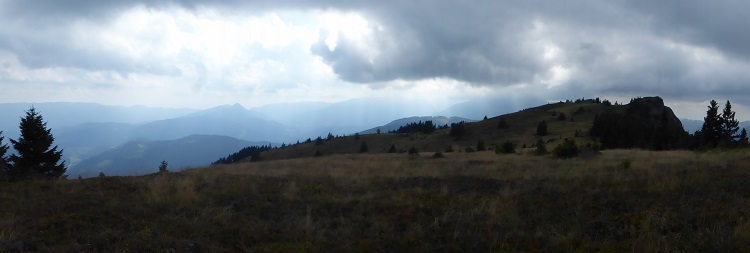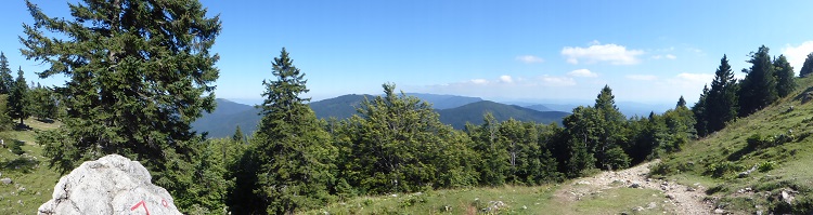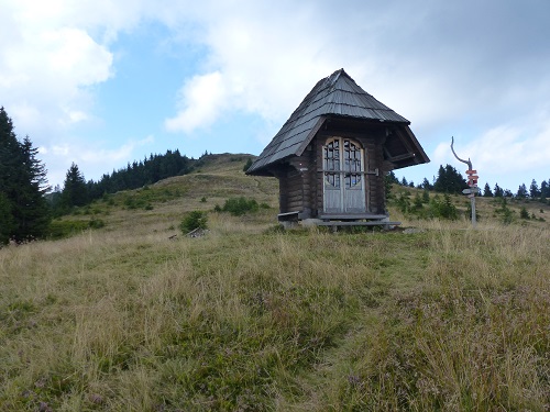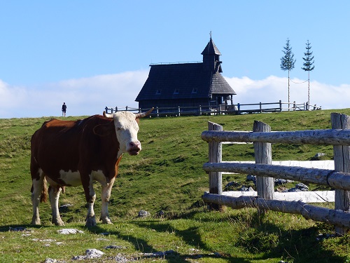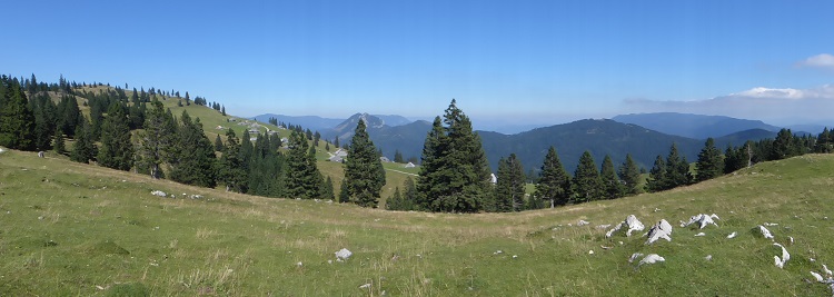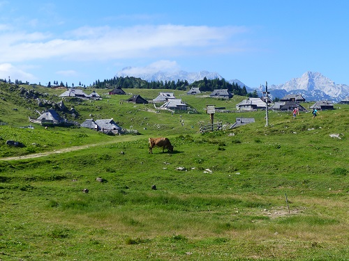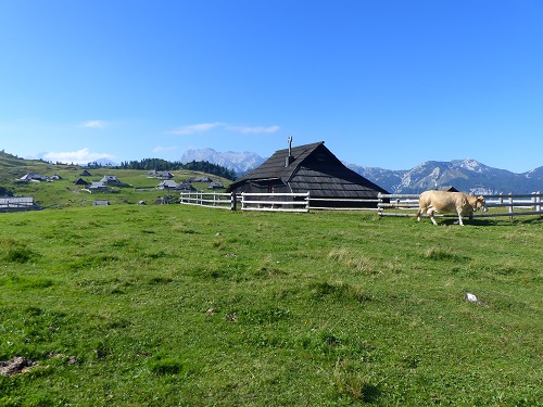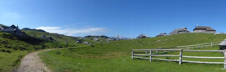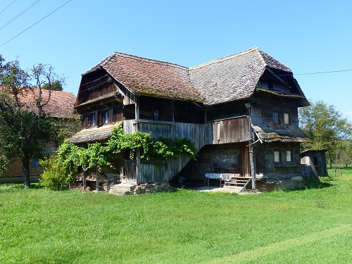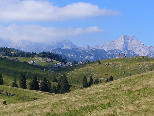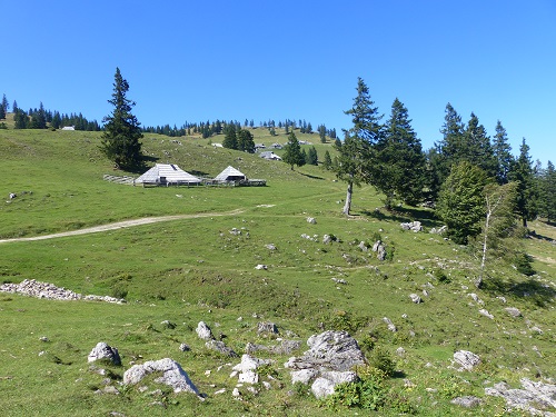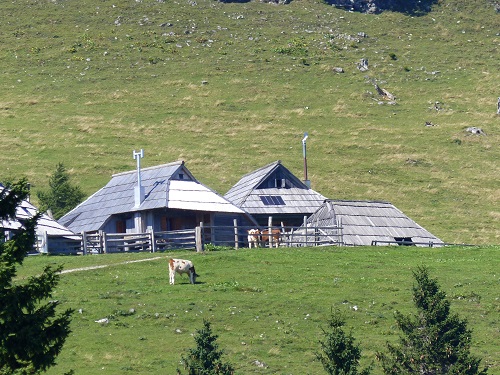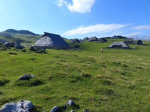 Nous poursuivons avec Google Maps pour rejoindre un début de randonnée trouvée sur un blog écrit par une solvène vivant en France. Elle compare les deux pays sur tout un tas de choses; meilleures plages, meilleure pizzas, etc. Presque tout le temps le point est pour la Slovénie... un peu orienté donc comme blog mais c'est là que nous trouvons les indications pour la randonnée de l'après midi: rejoindre un ensemble de villages d'altitude (1480 m) où les maisons sont toutes construites en bois. Le GPS nous indique une route sur la gauche qui a tout d'une chemin, quoique goudronné. Passées quelques maisons, nous voici sur une piste étroite qui se met à grimper. Bientôt les virages se font serrés pour prendre des lacets de plus en plus pentus. Nous croisons un combi volswagen dans la descente. Si lui passe, nous passerons aussi. Vient ensuite un 4x4, toujours dans le sens de la descente. Puis un autre 4x4 qui nous talonne à l'arrière. Tient, tient, beaucoup de 4x4 par ici, c'est vrai que le chemin s'y prête bien. Mais nous, nous n'avons pas de 4x4 ... et là, c'est le drame. Alors que le 4x4 nous pousse à l'arrière, j'accélère en voyant le pente se raidir. Pad de vitesse folle, je suis en première depuis un paquet de temps, La 2 n'est pas envisageable ici. Pas assez d'élan, trop de pente, les roues avant patinent. C'est fini, pas moyen d'aller plus loin. Nous sommes tout simplement à l'arrêt sur une pente raide, au milieu d'une piste étroite avec un 4x4 coincé derrière. Je mais les warning tout en m'arqueboutant sur les freins. Le 4x4 recule. Je dessers les freins avant, garde la main sur le frein à main et les dents bien serrées. Je ne vois pas bien où je vais. Chris descend pour mieux guider. Pour le moment, j'ai la route avant gauche dans la rigole pour l'écoulement des eaux. Pourvus que j'arrive à en sortir... Du coup, le 4x4 a un peu de place. Il nous dépasse et reprend sa route sans difficulté. Avec la pente, le Jumpy sort de la rigole juste en alignant les roues. Je descends, desserant un peu les freins avant et un peu le frein à main. Chris me fait signe que je vais pouvoir faire demi tour. Ah bon ! Mais où? Là me dit-elle. Je ne vois pas l'espace qu'elle me désigne, trop de pente pour voir le sol depuis mon siège. C'est une partie herbeuse qui mène à la seule maison croisée sur la piste. Pourvu que l'herbe ne soit pas grasse, parce que là, il n'y aurait plus d'espoir de s'en sortir par nous même... En y allant à petites doses, le demi-tour se trouve accompli. Ne reste plus qu'à descendre. La grosse frayeur est passée. Point sur la carte; il y a bien une route d'indiquée, comme les autres! Nous prenons la route de campagne principale. Ca grimpe, mais cette fois sur le bitume. Nous arrivons à un col, où nous découvrons l'arrivée d'une piste, sans doute celle que nous empruntions. Même pas envie de la prendre dans le sens de la descente, juste en la regardant depuis le col... Avec anxiété, nous prenons de nouveau une piste en montée. Cette fois, nous ne sommes pas les seuls véhicules "légers" à la prendre. Toutes les voitures s'y aventurent. Nous nous garons un peu en vrac, comme tout le monde et enfilons nos chaussures de rando. Ca grimpe. Il y a 340 mètres de dénivelé au total, mais quel joli spectacle une fois sortie de la forêt sombre: des terrains relativement plats où sont parsemées de jolies petites habitations. Très très joli. Nous continuons à grimper pour atteindre le village le plus haut, celui de Velika Planina. Ca vaut le coup d'oeil.
