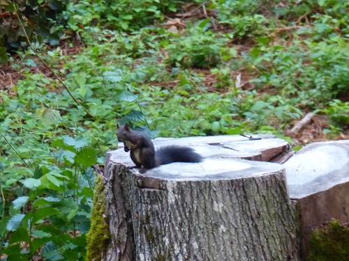 Ce matin, contre toute attente, il pleut. Une petite pluie qui rafraichi l'atmosphère. N'étant pas pressés, nous voyons le camping se vider petit à petit. Deux ecureuils jouent à se courser l'un l'autre.