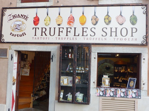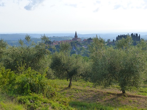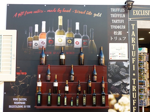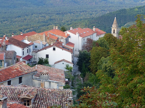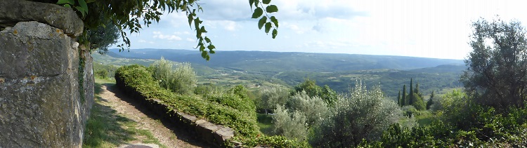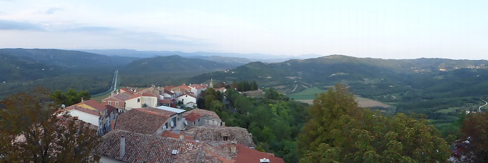 Nous nous perdons ensuite en tentant, puis en rejoignant finalement Motovum. L'accès au village est payant par la route. Par chance, le receveur n'a pas la monnaie de notre billet, il nous laisse finallement monter sans que nous ne nous acquittions du péage. Le village est enceint de murs et il y règne une ambiance moyenâgeuse. Mais une fois franchie la porte d'entrée, c'est une ambience estivale qui y règne ; terrasse de restaurant donnant sur le magnifique paysage alentours. Le village semble être un haut lieu de la truffe. Les menus mettent tous en évidence ce champignon et les petits commerces l'huile à la truffe.