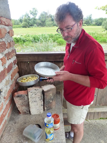 Nous prenons notre repas au resto/bistro : un goulash de cochon traditionnel (cochon sauvage mais domestique!) et de cerf pour moi, un équivalent avec 4 poissons d'eau douce pour CHris (carpe, brochet notamment). Au dessert, gâteau de caroube pour l'un et aux graines de pavot pour l'autre. Difficile de faire la différence gustative entre l'un et l'autre.