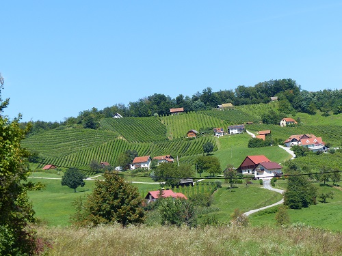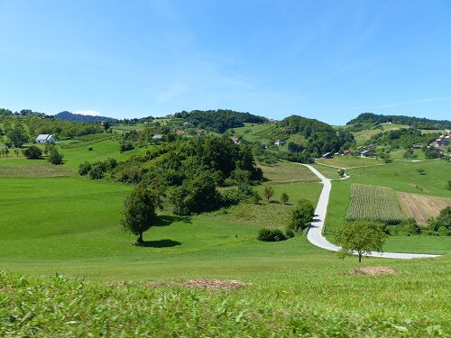 Nous quittons notre bivouac peu avant midi, non sans avoir pris le soin de mémoriser sur un smartphone le trajet pour aller à la capitale de la Solvénie via Radece. Le Wifi du camping permet de charge la carte qui reste mémorisée après la perte de la connexion. Le trajet permet d'éviter l'autoroute et de profiter de la campagne, verte et tout en relief montagneux. La route longe de chaque côté de petites montagnes très raides où sont perchés des villages agrippés aux parois. C'est très très joli. Nous grimpons pour nous poser le temps du repas. Oups, certains passages nécessitent de passer en première, jamais au dessus de la deuxième.