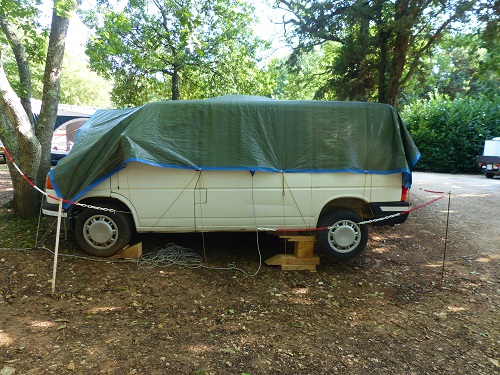 Nos voisins de camping habitent aussi leur citroen. Mais la leur est une deux cheveaux avec des petits rideaux, tout le monde se retourne sur cet équipage insolite.