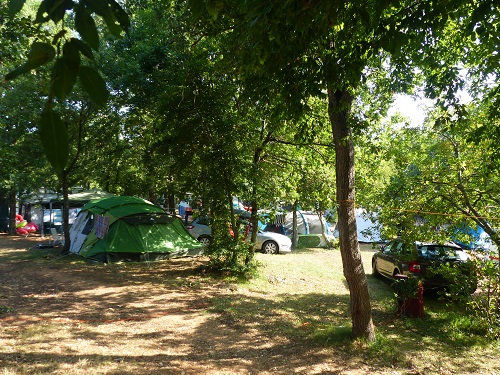 Le camping est boisé, sur le flan d'une petite colline. Aucun emplacement de défini, chacun se place comme il veut et il n'est pas difficile de se trouver son petit coin. Ça parle français pas bien loin de nous. Certaines caravanes sont entourées de végétation. Sans doute des espaces qui sont devenus des emplacements à l'année.