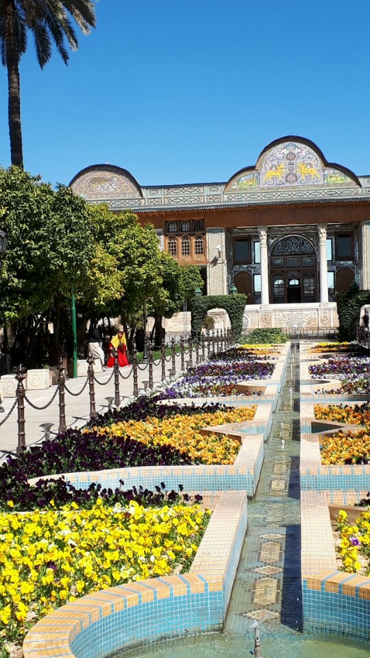 Palais Narendjestan - jardin fleuri, palmiers et orangers fleur - bas reliefs copies de Persepolis -plafonds peints - visites boutiques attenantes: tapis Iraniens