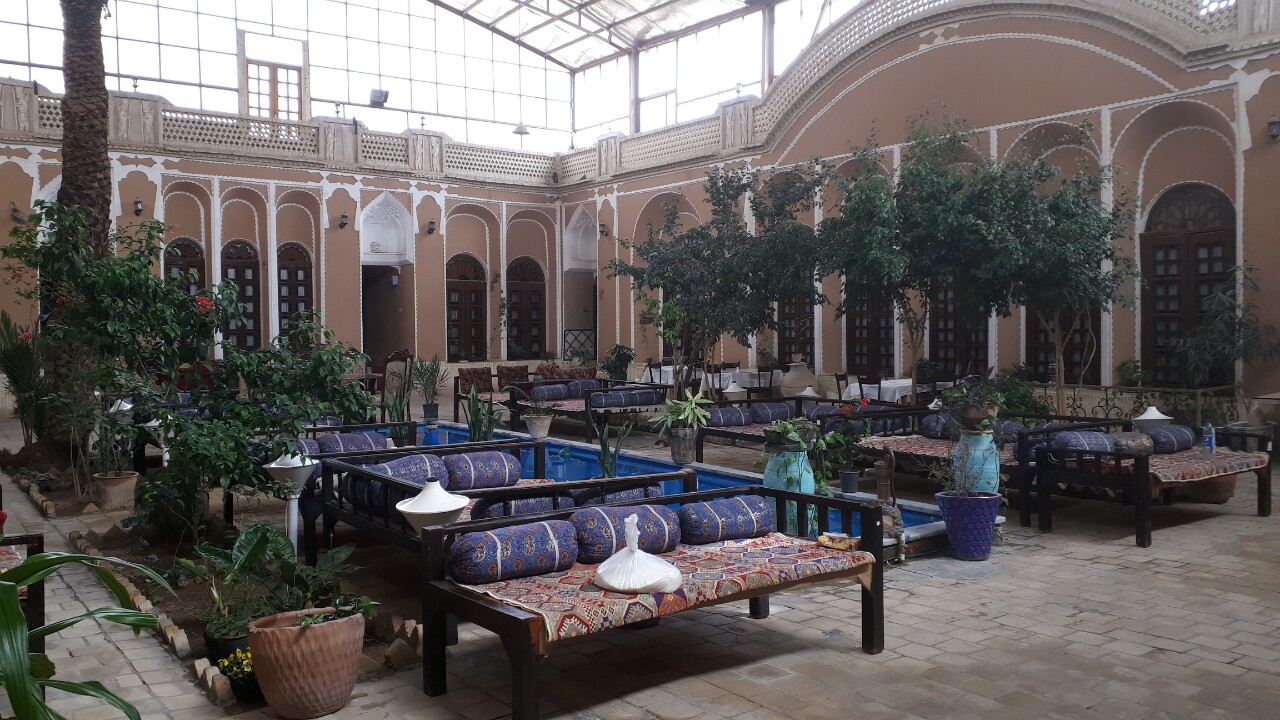 Arrêt à Bafgh pour déjeuner (nous testons la position assise par terre dans un salon car la table et les chaîses sont recouvertes de poussière). Je teste un poisson, Didier une brochette de viande hachée et Dvgo du poulet, avec les inevitables riz et yaourt.