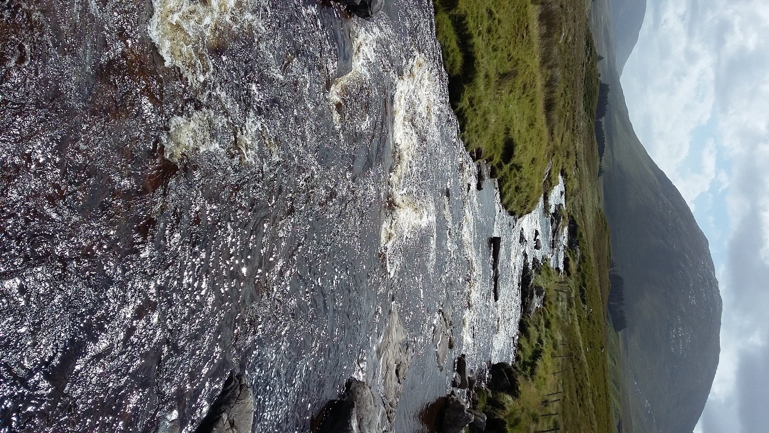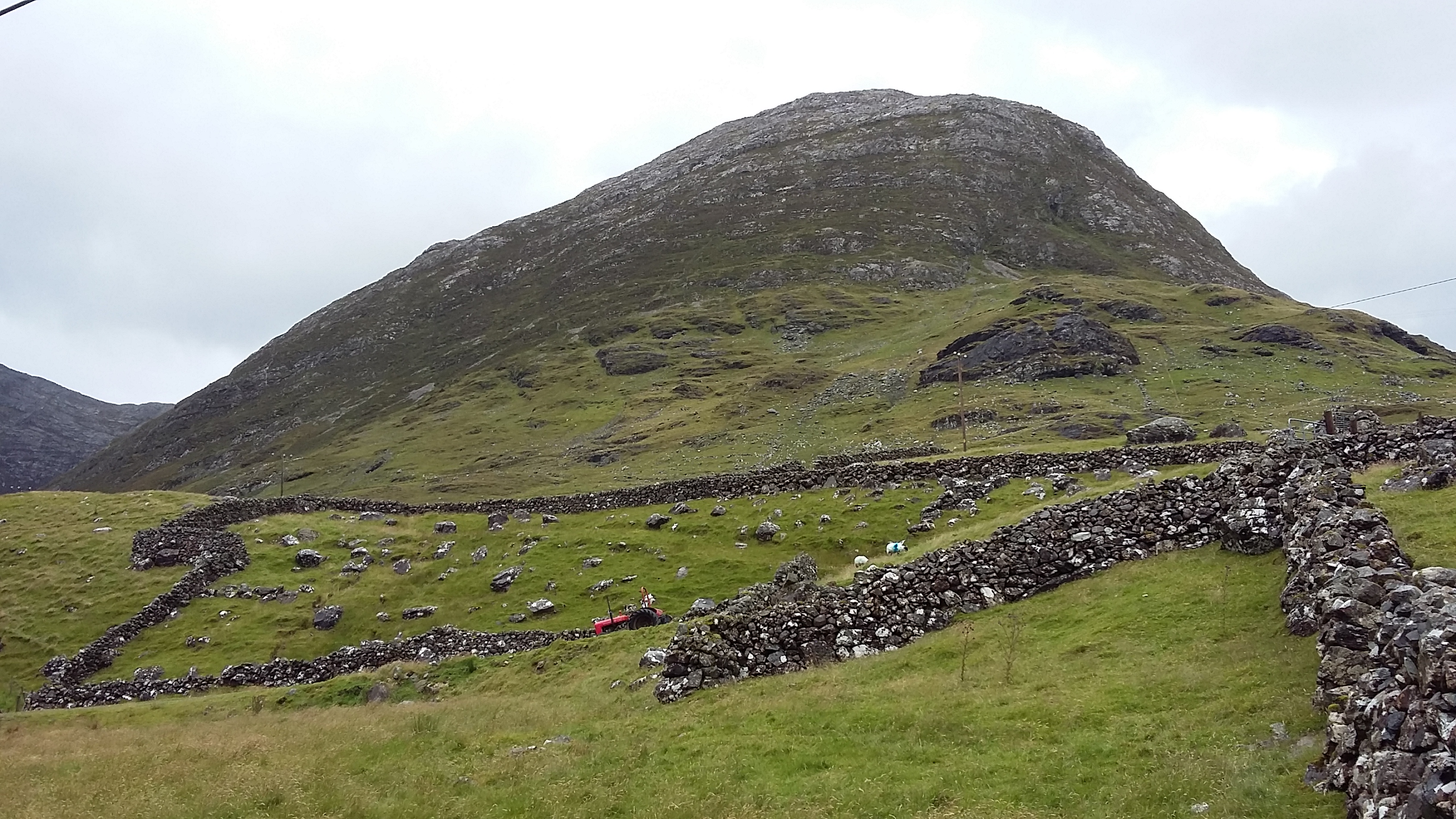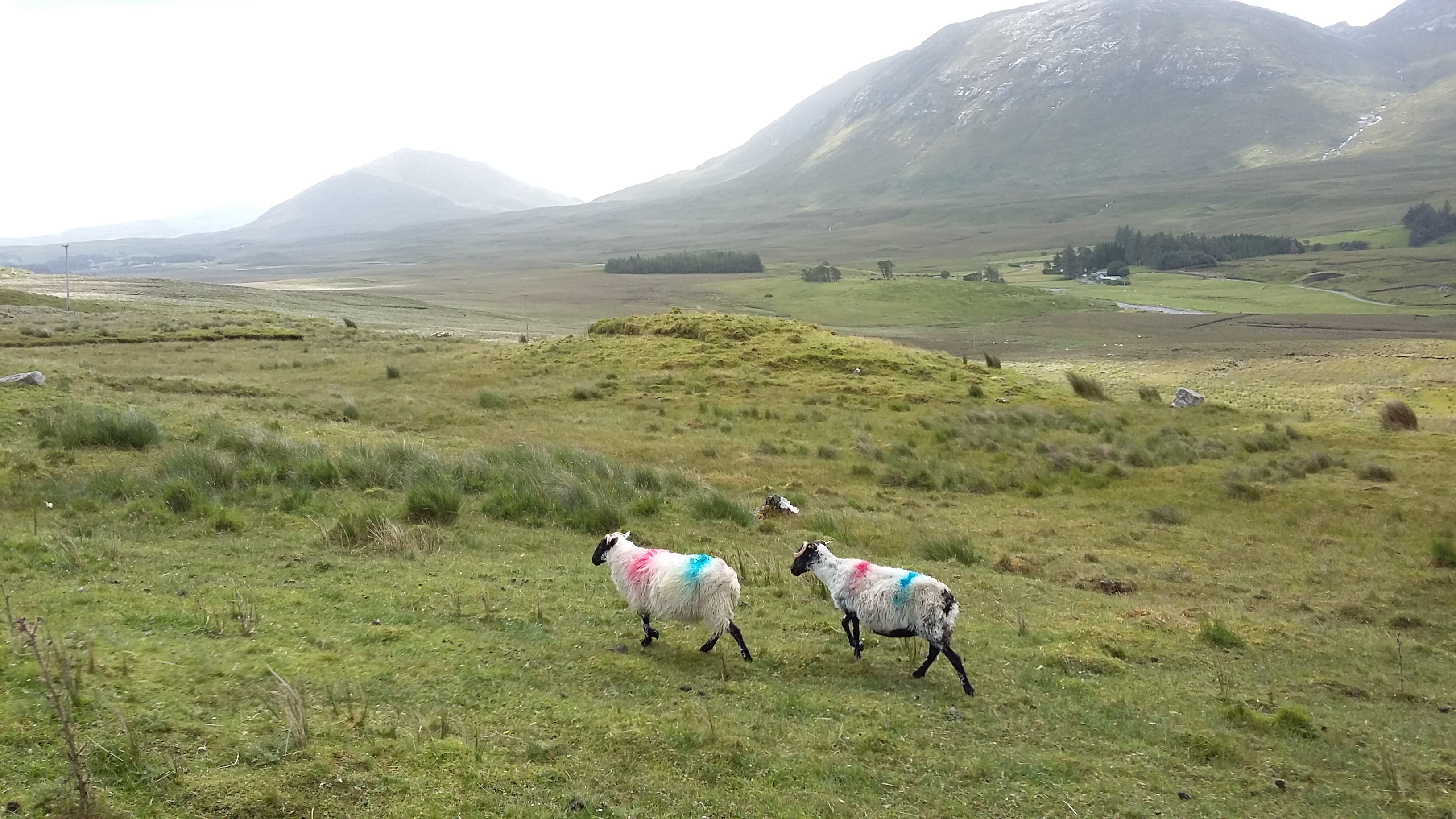 Départ le long de la route. Le vent souffle fort mais il ne fait pas froid. Nous évitons les rasades d'eau projetées par les voitures. Au moment où la Western Way quitte la route, Manu et Didier continuent pour aller à l'épicerie un peu plus loin, pendant que Hy et moi les attendons. Puis nous démarrons en suivant une petite route sous un ciel toujours aussi changeant. On longe des prairies avec moutons et rivière, bordées par des montagnes. Deci delà quelques fermes égayent le paysage. Arrivé à un petit village, le chemin tourne à gauche et s élève dans la montagne. Magnifiques paysages surtout quand le soleil daigne montrer le bout de son nez. La petite route rejoint maintenant un lieu plus austère, nous longeons une vallée avec juste une ferme et ses moutons aux couleurs de la France. Elle continue de monter jusqu'à une barrière que nous franchissons et qui marque l'entrée des pâturages de la chapelle de st Patrick, que nous atteignons après une petite grimpette. Ce sera notre pause déjeuner, à peu près à l abri du vent. Attention moment culturel : il s agit d'un lieu de culte catholique clandestin + route de passage entre Clifden et Galway (source : Manu. Espérons que la source soit exacte !).