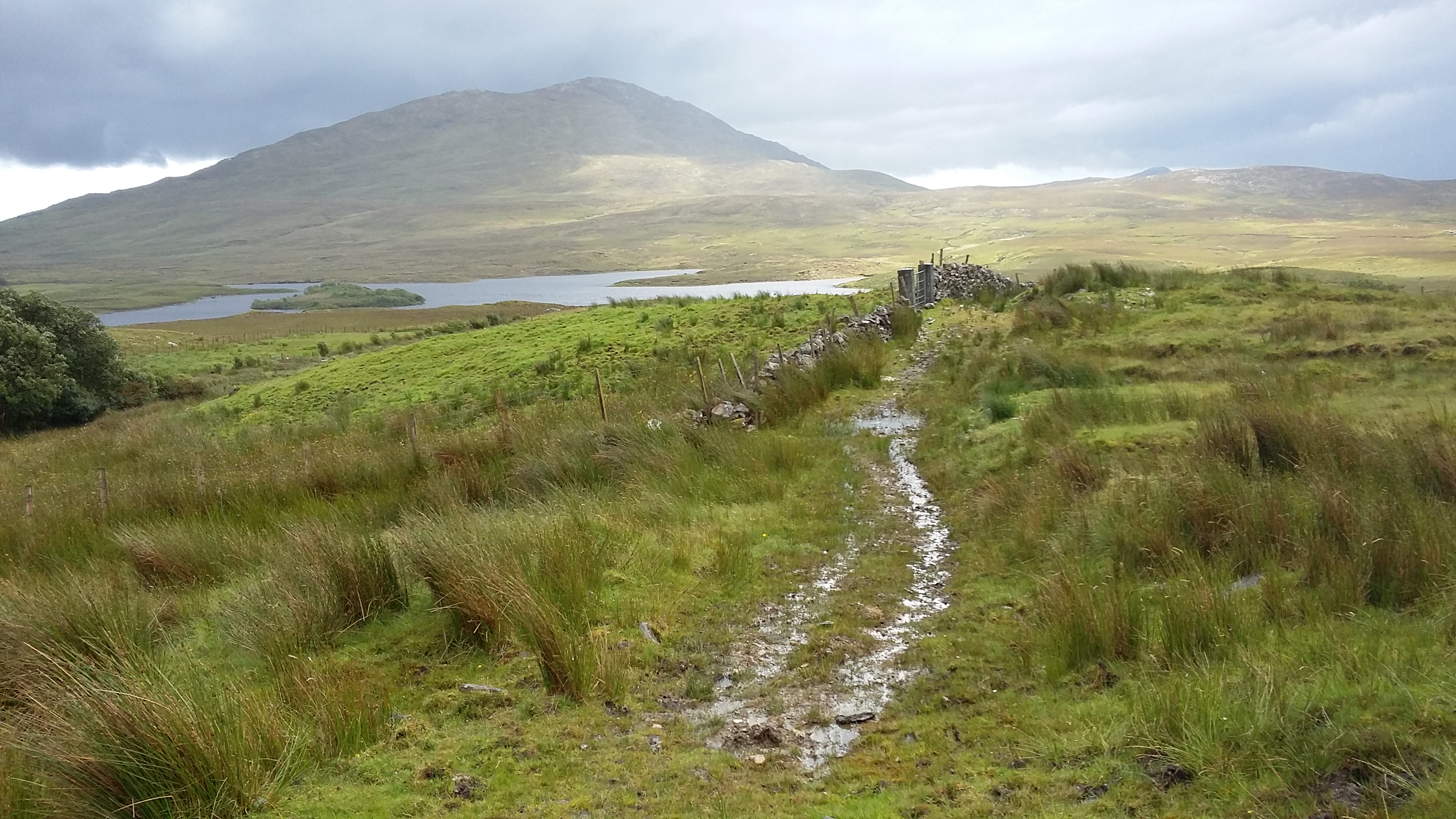 Nous sommes tous vêtus d'habits de pluie. Cela sera utile, mais sans plus en fait. Rien à voir avec la veille. La pluie est discontinue et ne dure pas. Le parcours se fait facilement. A tel point que nous ne ferons pas de pause casse croûte. Nous atteignons Leenan en longeant le fjord. Superbe paysage.