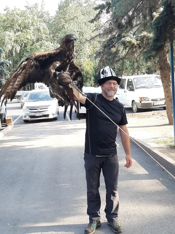 Nous finissons notre tour en nous installant en terrasse pour dîner, non sans avoir croisé un fauconnier accompagné de son aigle. L'aigle est un symbole du pays. Il est notamment utilisé pour la pratique de la chasse.