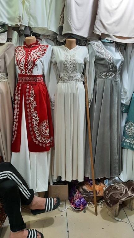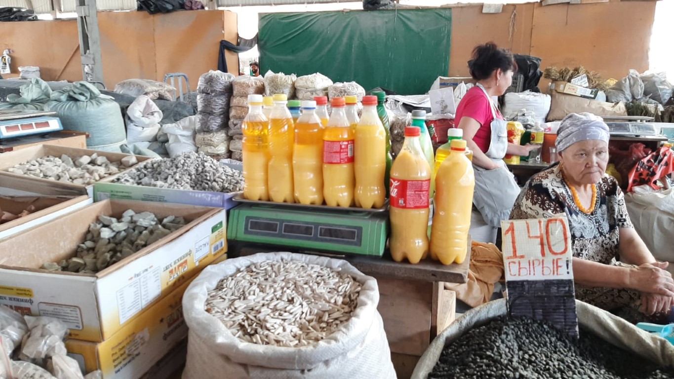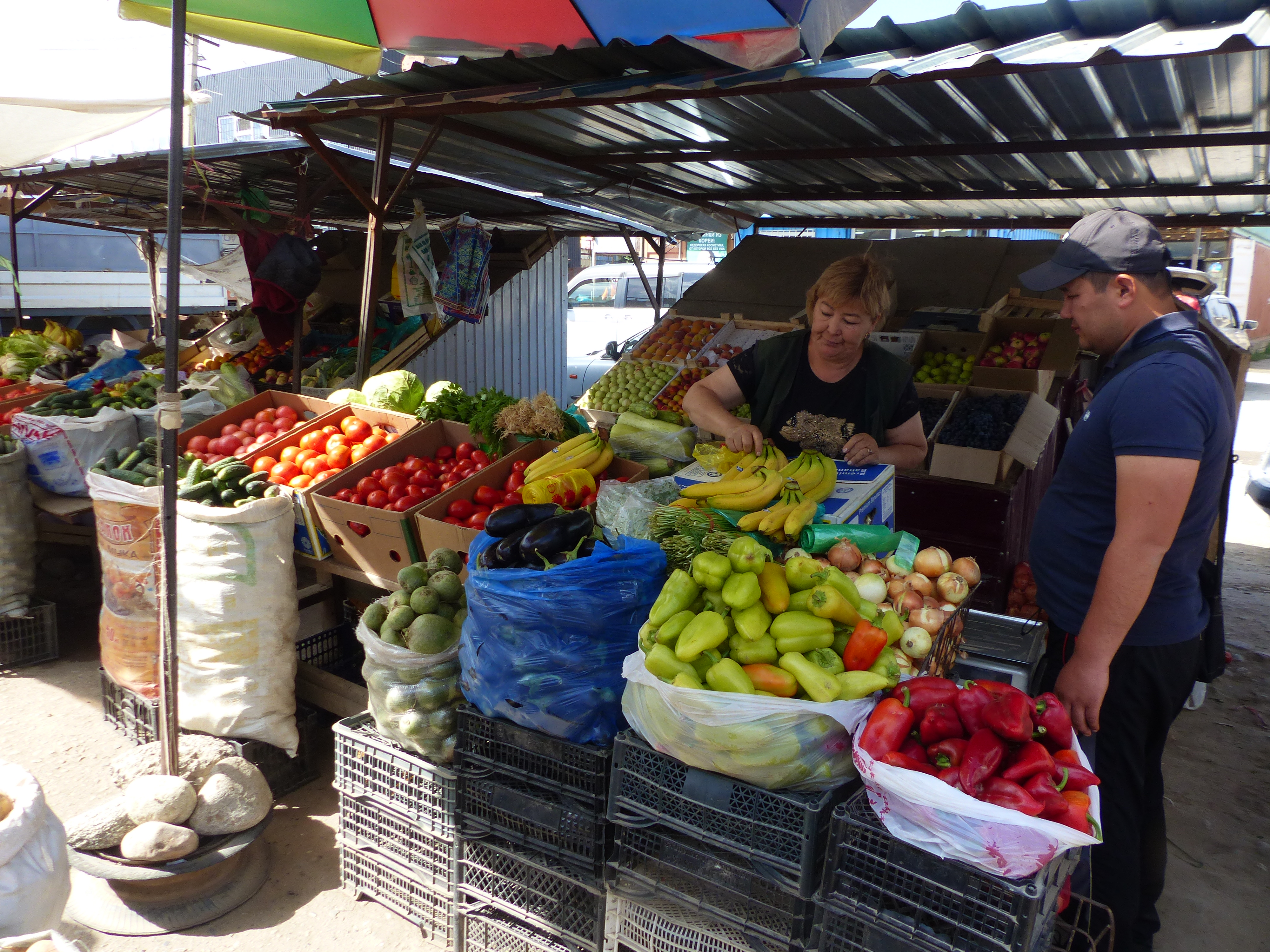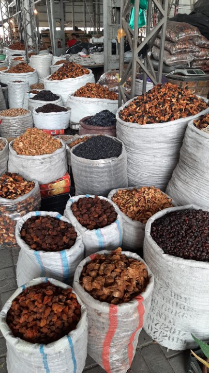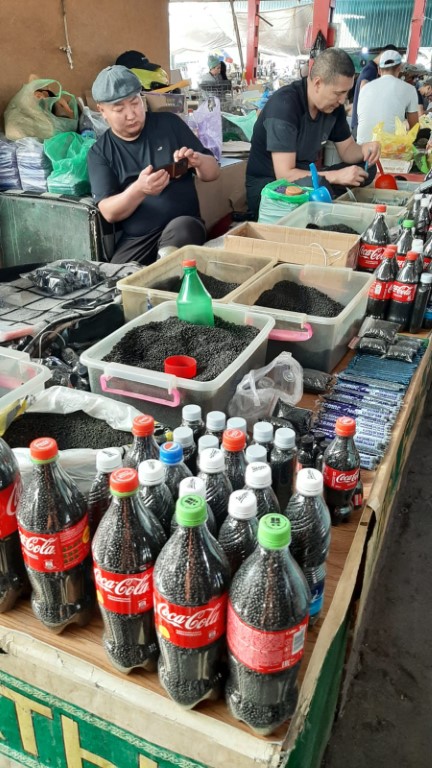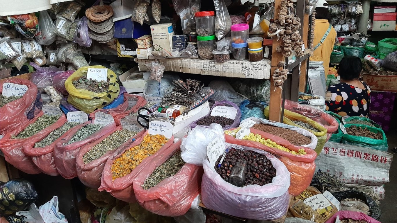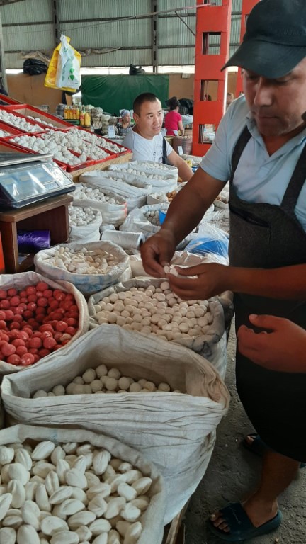 L'après midi, Oulan nous emmène au grand bazar. L'endroit est assez impressionnant, les vendeurs sont regroupés par spécialité. Ils forment des quartiers, où fourmillent, par exemple, un nombre à n'en plus finir de vendeurs de chaussures, de vendeurs de fruits secs, de bouchers, etc. Nous restons un bon moment devant les étalages de produits medicinaux à prendre en infusion ... comble du raffinement, en plus des fleurs (inconnues), du foin, du trèfles et j en passe, il y a des grenouilles et des serpents séchés. Il parait que c est excellent pour la santé ! Bon il se trouve qu on n en a pas besoin car on est en excellente (santé)... On a également négocié des noix de macadamia et abricots séchés, goûté le kourout (billes ne fromage séché hyper salé... heureusement que la bille est petite...), admiré les étalages vendant une sorte de tabac (en mini billes noires ressemblant à des lentilles ; je ne sais pas exactement ce que c est mais ça ne doit pas être très sain car dans certains pays c est interdit), comparé le prix du bifteck kirgize avec le français (le vendeur a ouvert des grands yeux...il s est dit qu en montant une affaire d exportation de viande de boeuf il ferait fortune...),