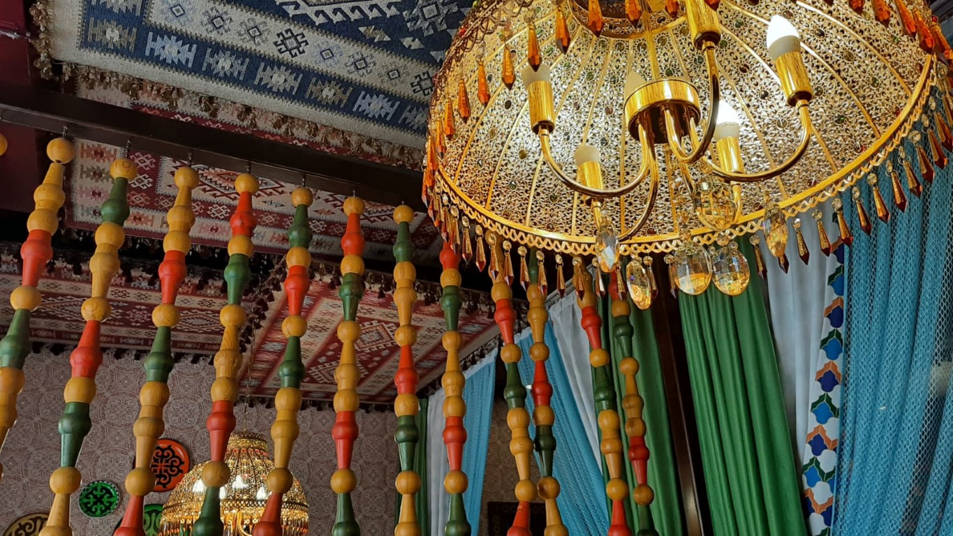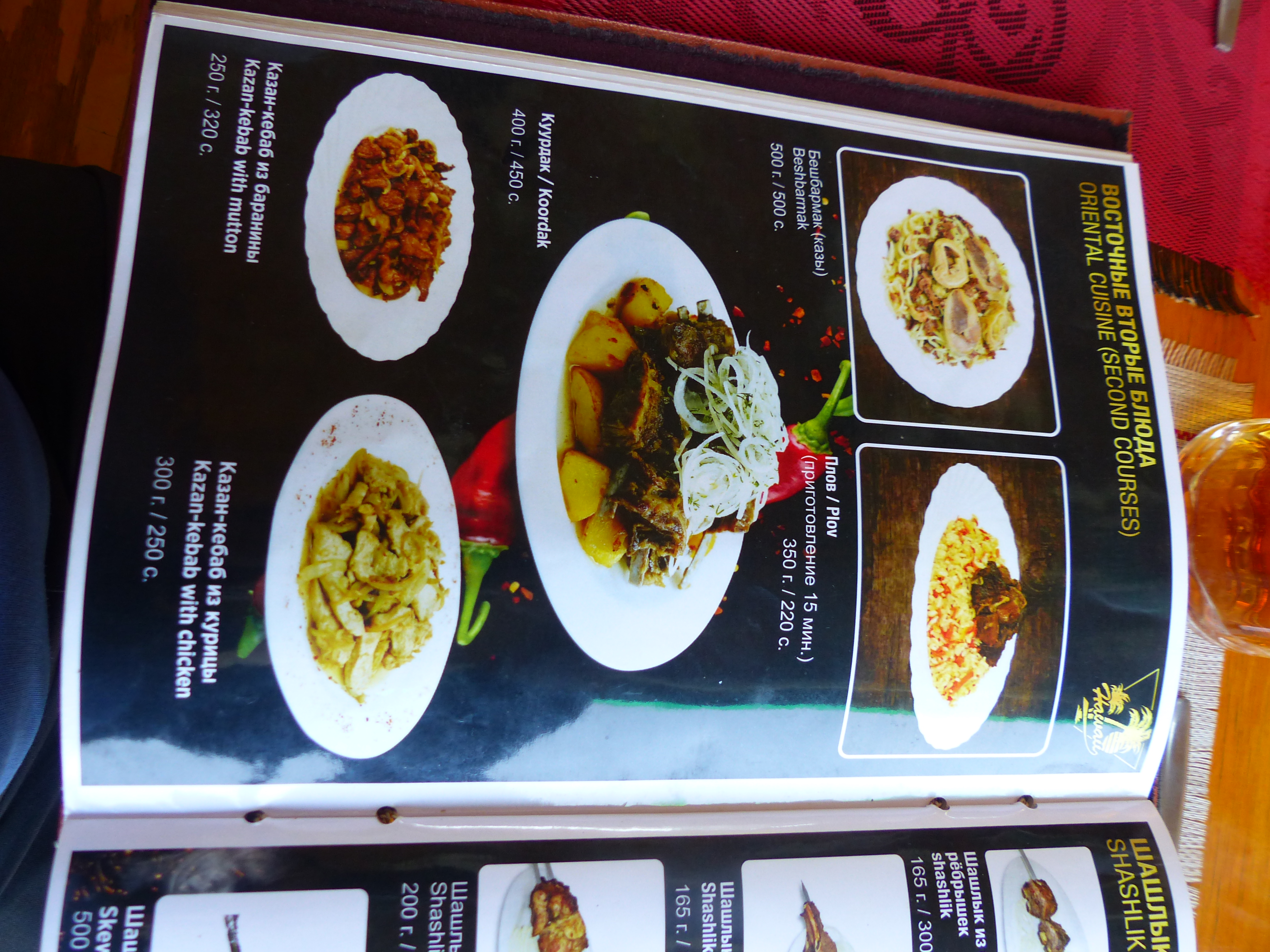 Nous déjeunons dans un beau restaurant signalé par les locaux. Les menus sont organisés sous la forme d'un grand livre avec des photos des plats. Pratique pour se faire une idée de ce qui est proposé. Nous avons choisi quand même un peu au hasard. IL faut savoir que les kirghizes ont tendance à manger de la viande. Les soupes en comptent toutes. Le repas est accompagné de thé, même si nous pouvons commander d'autres boissons (coca, bière, eau, etc). L'apéro du jour est un lait de jument fermenté salé. Spécial, mais ça se boit ! Côté plat, Didier prend des gros raviolis fourrés à la viande ; Chris choisit des pâtes avec des poivrons et de la viande.