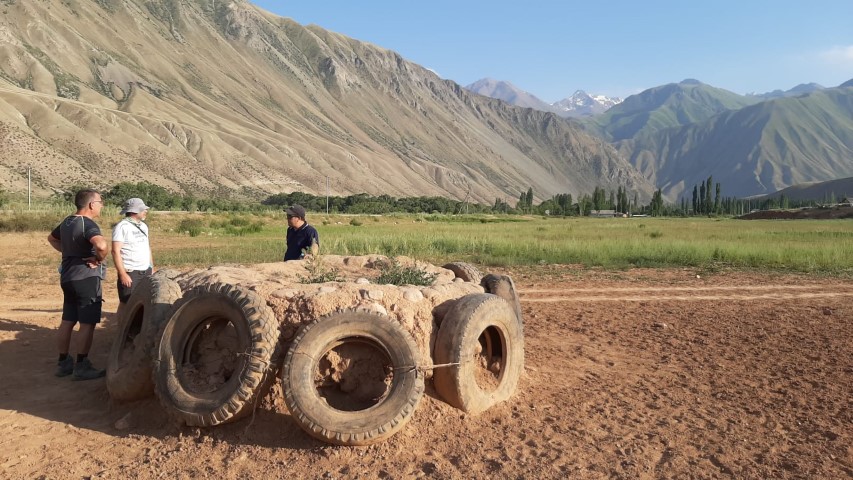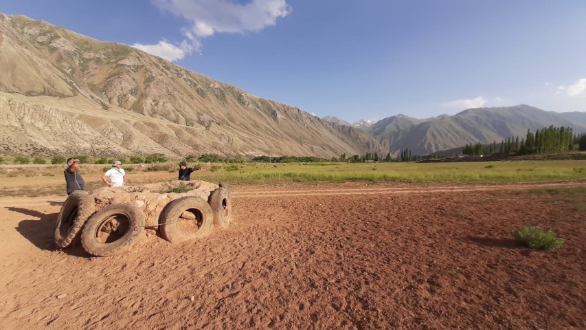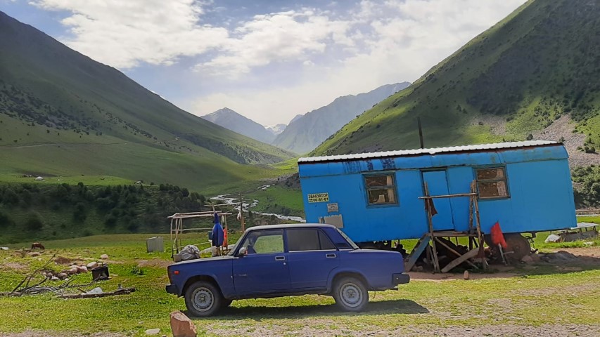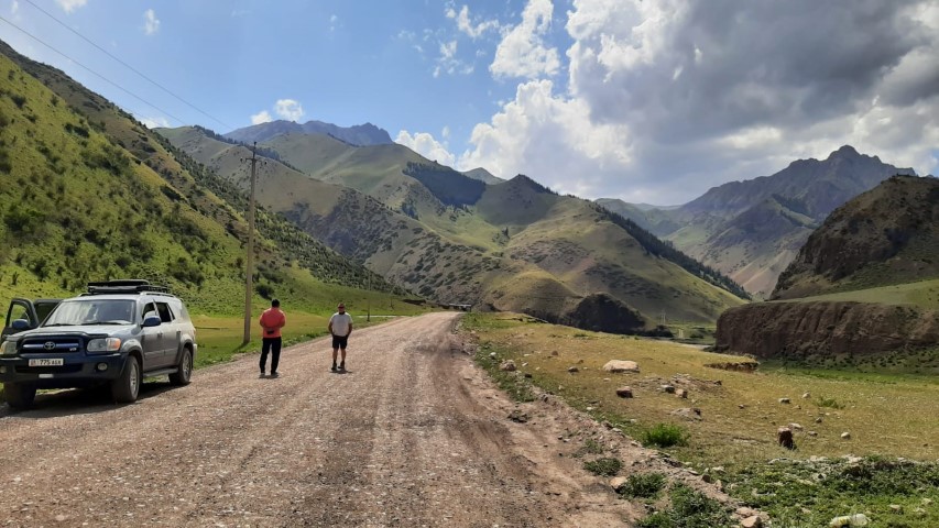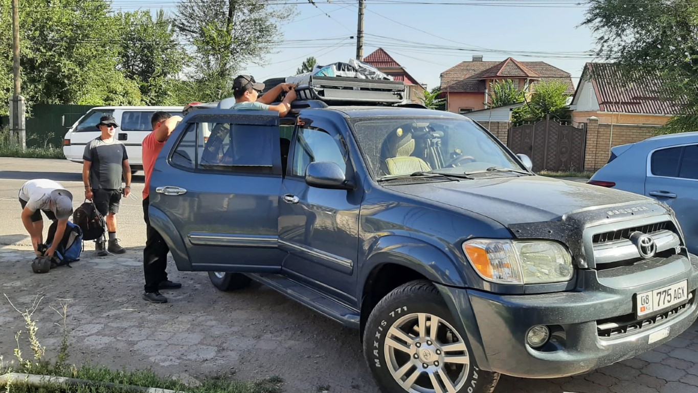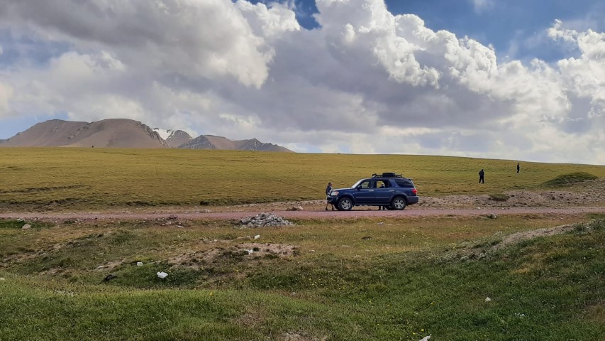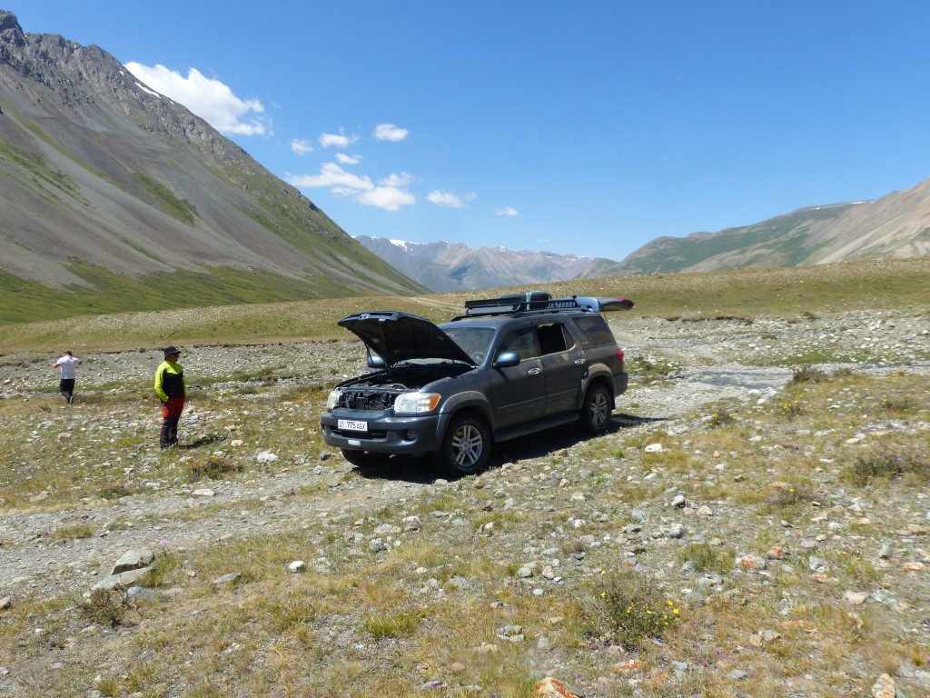 Altimbeck organise le chargement du 4x4 et nous voici prêt à partir. Aujourd'hui, nous avons 80 kilomètres de piste, le passage du col Arabel à 3800m puis une bonne piste qui dessert la mine d'or de Kumtor avant d'atteindre la ville de Barskoon où nous devrions nous baigner dans le lac Issyk Kul.